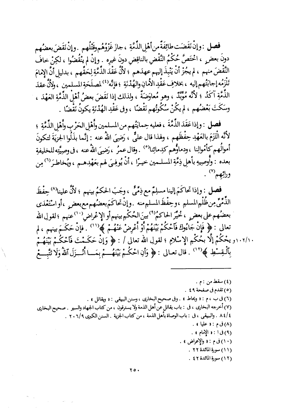 فصل: وإذا عَقَدَ الذِّمَّةَ، فعليه حِمايَتُهم من المسلمين وأَهْلِ الحَرْبِ وأَهْلِ الذِّمَّةِ؛ لأنَّه الْتَزَمَ بالعَهْدِ حِفْظَهم، ولهذا قال علىٌّ، رَضِىَ اللَّهُ عنه: إنَّما بذَلُوا الجزيَةَ لتكونَ أموالُهم كأمْوالِنا، ودماؤُهم كدِمائِنا (٥). وقال عمرُ، رَضِىَ اللَّهُ عنه، فى وصِيَّتِه للخليفةِ بعده: وأُوصِيهِ بأهلِ ذِمَّةِ المسلمين خيرًا، أَنْ يُوفِىَ لهم بعَهْدِهم، ويُخاطرَ (٦) مِن ورائِهِم (٧).