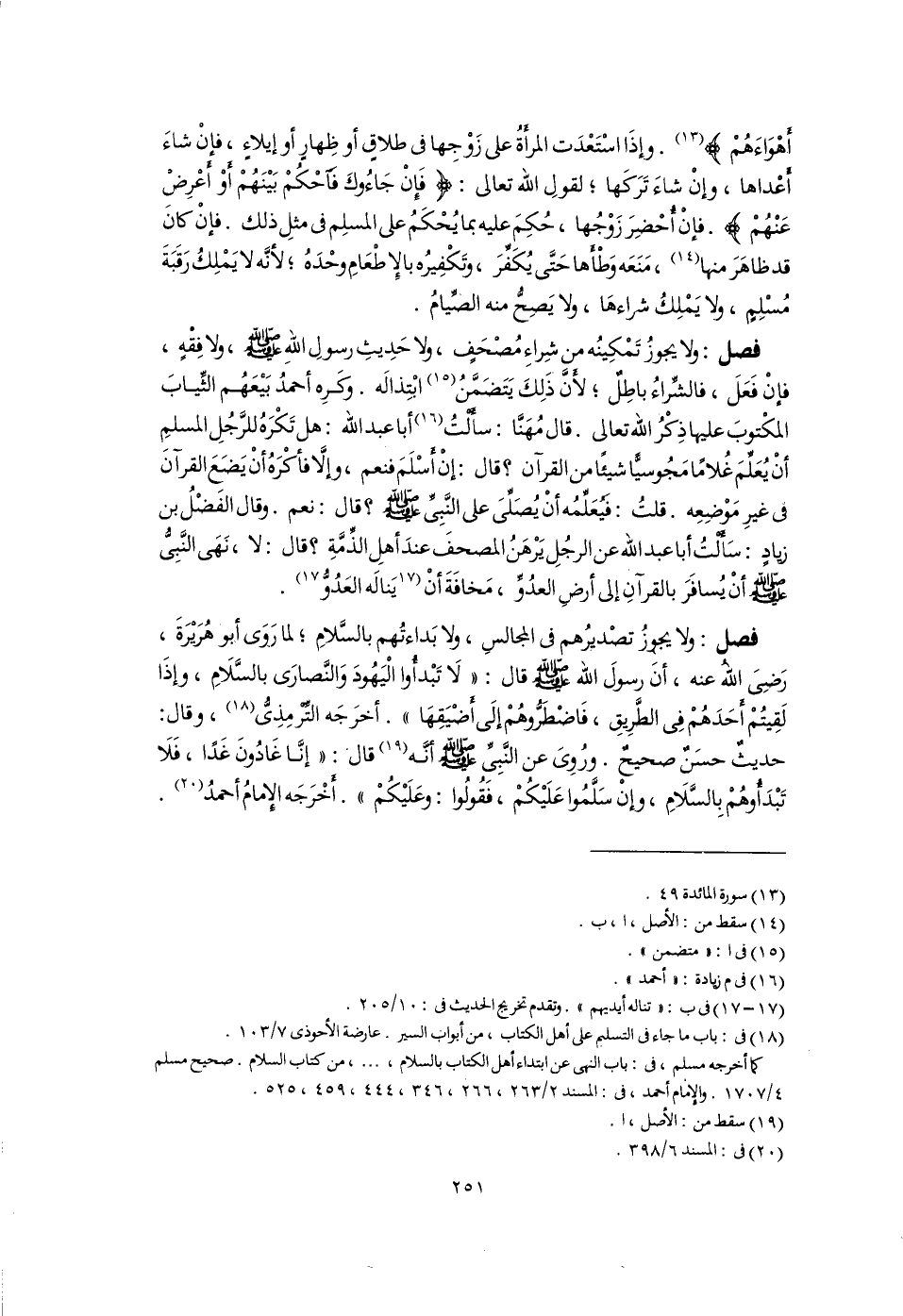 فصل: ولا يجوزُ تَمْكِينُه من شِراءِ مُصْحَفٍ، ولا حَدِيثِ رسولِ اللَّه -صلى اللَّه عليه وسلم-، ولا فِقْهٍ، فإنْ فَعَلَ، فالشِّراءُ باطِلٌ؛ لأنَّ ذَلِكَ يَتَضَمَّنُ (١٥) ابْتِذالَه. وكَرِه أحمدُ بَيعَهُم الثِّيابَ المكْتوبَ عليها ذِكْرُ اللَّه تعالى. قال مُهَنَّا: سأَلْتُ (١٦) أبا عبد اللَّه: هل تَكْرَهُ للرَّجُلِ المسلمِ أَنْ يُعَلِّمَ غُلامًا مَجُوسيًّا شيئًا من القرآن؟ قال: إنْ أَسْلَمَ فنعم، وإلَّا فأكْرَهُ أَنْ يَضَعَ القرَآنَ فى غيرِ مَوْضِعِه. قلتُ: فَيُعَلِّمُه أَنْ يُصَلِّىَ على النَّبِىِّ -صلى اللَّه عليه وسلم-؟ قال: نعم. وقال الفَضْلُ بن زيادٍ: سَأَلتُ أبا عبد اللَّه عن الرجُلِ يَرْهَنُ المصحفَ عندَ أهلِ الذِّمَّةِ؟ قال: لا، نَهَى النَّبِىُّ -صلى اللَّه عليه وسلم- أَنْ يُسافَرَ بالقرآنِ إلى أرضِ العدُوِّ، مَخافَةَ أَنْ [يَنالَه العَدُوُّ] (١٧).