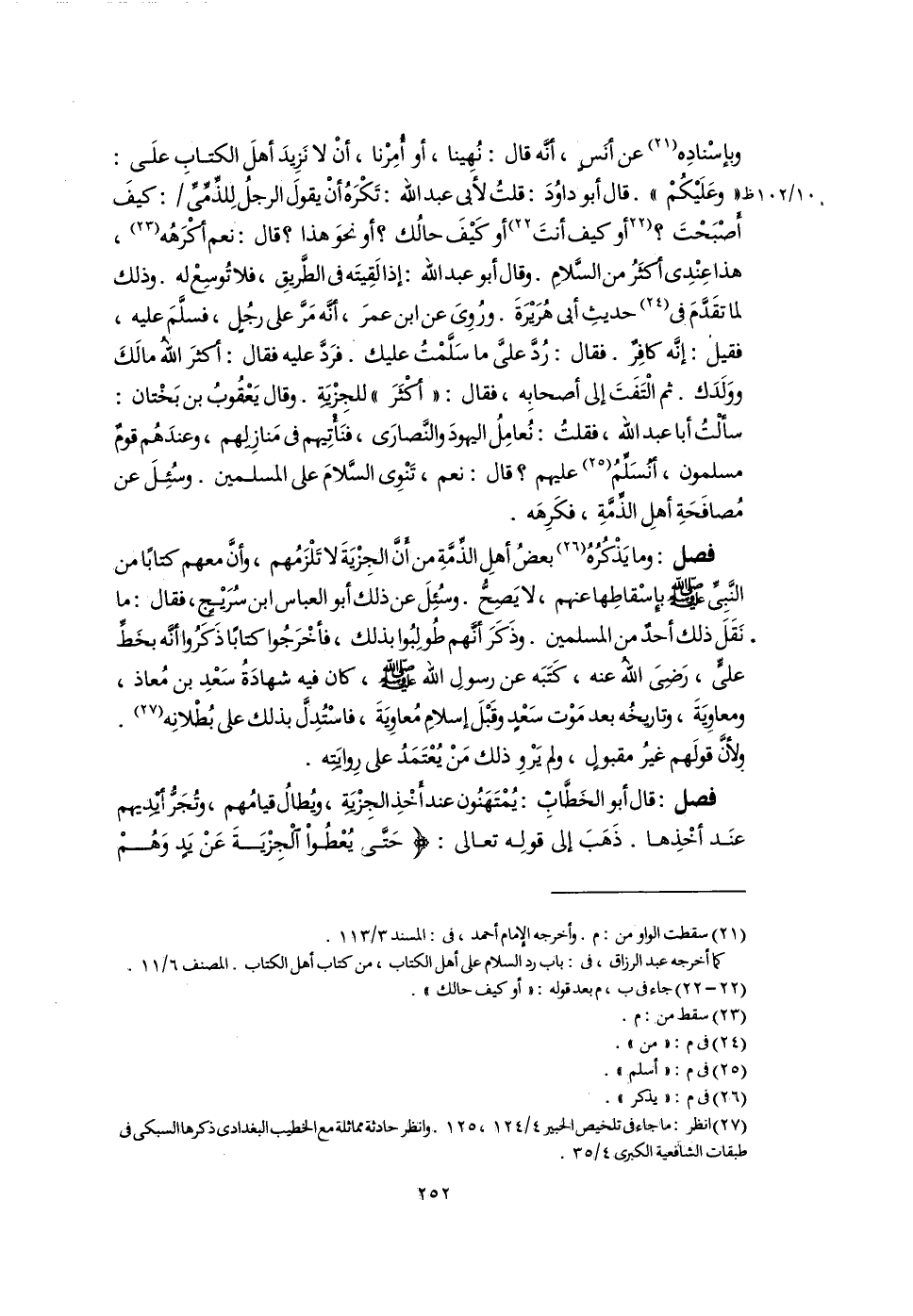وبإسْنادِه (٢١) عن أنَسٍ، أنَّه قال: نُهِينا، أو أُمِرْنا، أَنْ لا نَزِيدَ أهلَ الكتابِ علَى: "وعَلَيْكُمْ". قال أبو داوُدَ: قلتُ لأبى عبد اللَّهُ: تَكْرَهُ أَنْ يقولَ الرجلُ لِلذِّمِّىِّ: كيفَ أصْبَحْتَ؟ [أو كيف أنتَ] (٢٢) أو كَيْفَ حالُك؟ أو نحوَ هذا؟ قال: نعم أكْرَهُه (٢٣)، هذا عِنْدِى أكثَرُ من السَّلامِ. وقال أبو عبد اللَّه: إذا لَقِيتَه فى الطَّريقِ، فلا تُوسِعْ له. وذلك لما تقَدَّمَ فى (٢٤) حديثِ أبى هُرَيْرَةَ. ورُوِىَ عن ابن عمرَ، أنَّه مَرَّ على رجُلٍ، فسلَّمَ عليه، فقيل: إنَّه كافِرٌ. فقال: رُدَّ على ما سَلَّمْتُ عليك. فرَدَّ عليه فقال: أكثرَ اللَّهُ مالَكَ ووَلَدَك. ثم الْتَفَتَ إلى أصحابِه، فقال: "أكْثَرَ" للجِزْيَةِ. وقال يَعْقُوبُ بن بَخْتان: سألْتُ أبا عبد اللَّه، فقلتُ: نُعامِلُ اليهودَ والنَّصارَى، فنَأْتِيهم فى مَنازِلهم، وعندَهُم قومٌ مسلمون، أنُسَلِّمُ (٢٥) عليهم؟ قال: نعم، تَنْوِى السَّلامَ على المسلمين. وسُئِلَ عن مُصافَحَةِ أهلِ الذِّمَّةِ، فكَرِهَه.