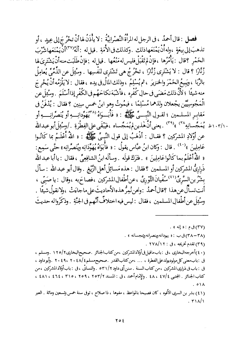 فصل: قال أحمدُ، فى الرجل له المرأَةُ النَّصْرانِيَّةُ: لا يأذَنُ لها أَنْ تخْرُجَ إلى عِيدٍ، أو تذهبَ إلى بِيعَةٍ، وله أَن يَمْنَعَها ذلك. وكذلك فى الأَمَةِ. قيل له: ألَهُ (٣٧) أن يَمْنَعَها شُرْبَ الخَمْرِ؟ قال: يَأْمُرُها، فإنْ لم تَقْبَلْ فليس له مَنْعُها. قيل له: فإنْ طَلَبَت منه أَنْ يَشْتَرِىَ لها زُنَّارًا؟ قال: لا يَشْتَرِى زُنَّارًا، تخْرُجُ هى تَشْتَرِى لنَفْسِها. وسُئِلَ عن الذِّمِّىِّ يُعامِلُ بالرِّبَا، ويَبِيعُ الخَمْرَ والخنزيرَ، ثم يُسْلِمُ، وذلك المالُ فى يدِه، فقال: لا يَلْزَمُه أَنْ يُخْرِجَ منه شيئًا؛ لأنَّ ذلك مَضَى فى حالِ كُفْرِه، فأشْبَهَ نكاحَهُم فى الكُفْرِ إذا أسْلَمَ. وسُئِلَ عن الْمَجُوسِيِّيْن يجْعلان ولدَهما مُسْلِمًا، فيمُوتُ وهو ابنُ خمسِ سِنِين؟ فقال: يُدْفنُ فى مَقابرِ المسلمين؛ لقولِ النَّبىِّ -صلى اللَّه عليه وسلم-: "فَأَبَوَاهُ [يُهَودانِهِ أو يُنَصِّرانِهِ أو يُمَجسانِه] (٣٨) " (٣٩). يعنى أنَّ هذين لم يُمَجِّساه، فيَبْقَى على الفِطرَةِ. وسُئِلَ أبو عبد اللَّه عن أوْلادِ المشركين؟ فقال: أذْهَبُ إلى قولِ النَّبىِّ -صلى اللَّه عليه وسلم-: "اللَّهُ أعْلَمُ بما كَانُوا عَامِلِينَ" (٤٠). قال: وكان ابنُ عبَّاس يقولُ: "فأبوَاهُ يُهَودانِه ويُنَصِّرانِه" حتَّى سَمِع: "اللَّهُ أعْلَمُ بما كَانُوا عَامِلِينَ". فتَرَكَ قولَه. وسألَه ابنُ الشافِعِىِّ، فقال: يا أبا عبد اللَّه ذَرِارِىُّ المشركين أو المسلمين؟ فقال: هذه مَسائِلُ أهلِ الزَّيْغِ. وقال أبو عبد اللَّه: سألَ بشْرُ بن السَّرِىِّ (٤١) سُفْيانَ الثَّوْرِىَّ، عن أطْفالِ المشركين، فصاحَ به، وقال: يا صَبِىّ، أَنت تسأَلُ عن هذا؟ قال أحمدُ: ونحن نُمِرُّ هذه الأحاديثَ على ما جاءَتْ، ولا نقولُ شيئًا. وسُئِلَ عن أطْفالِ المسلمين، فقال: ليس فيه اختلافٌ أنَّهم فى الجنَّةِ. وذكَرُوا له حديثَ