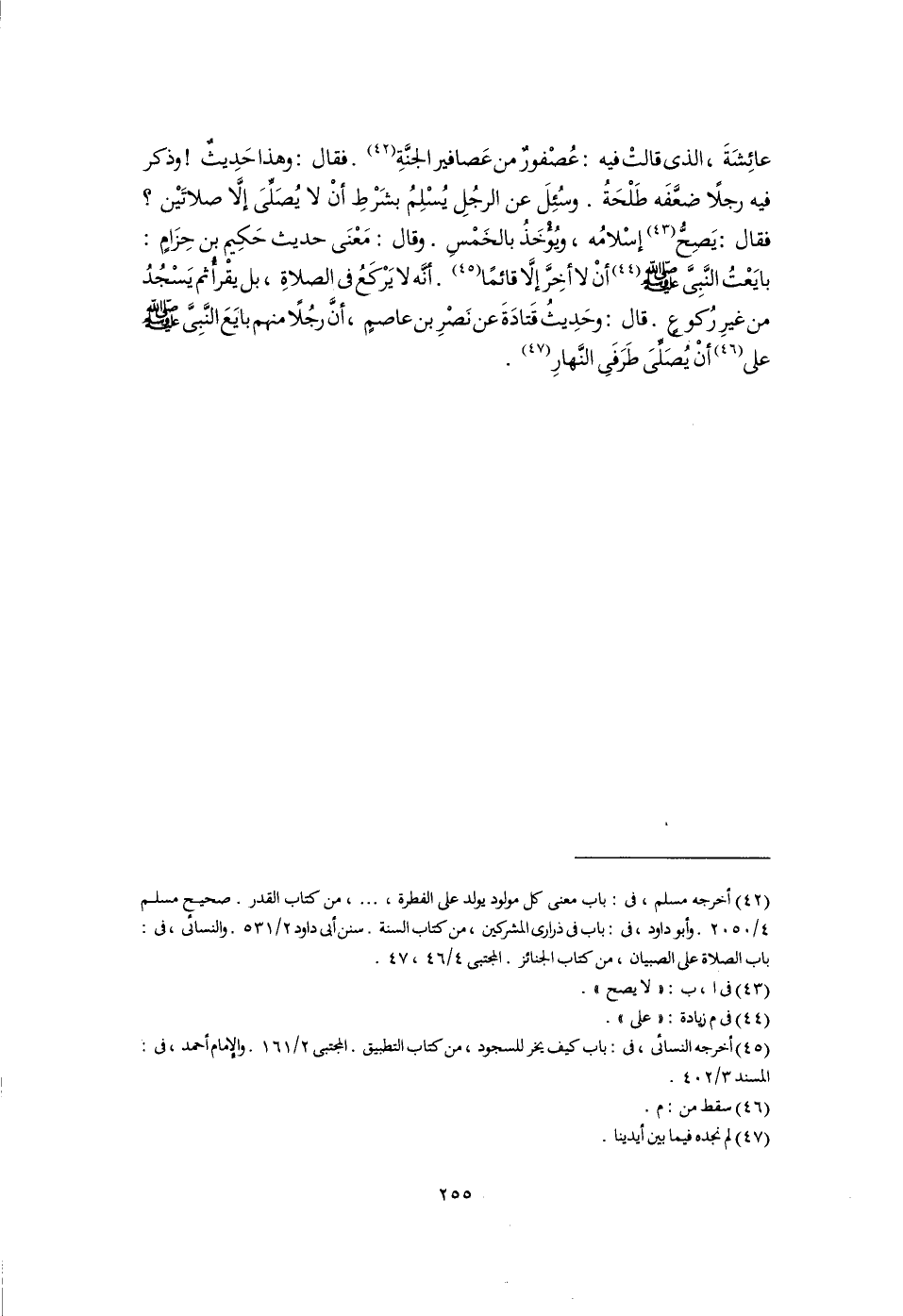 عائِشَةَ، الذى قالتْ فيه: عُصْفورٌ من عَصافير الجنَّةِ (٤٢). فقال: وهذا حَدِيثٌ! وذكر فيه رجلًا ضعَّفَه طَلْحَةُ. وسُئِلَ عن الرجُلِ يُسْلِمُ بشَرْطِ أَنْ لا يُصَلِّىَ إلَّا صلاتَيْن؟ فقال: يَصِحُّ (٤٣) إسْلامُه، ويُوخَذُ بالخَمْسِ. وقال: مَعْنَى حديث حَكِيم بن حِزَامٍ: بايَعْتُ النَّبِىَّ -صلى اللَّه عليه وسلم- (٤٤) أَنْ لا أخِرَّ إلَّا قائمًا (٤٥). أنَّه لا يَرْكَعُ فى الصلاةِ، بل يقْرأُ ثم يَسْجُدُ من غيرِ رُكوعٍ. قال: وحَدِيثُ قَتادَةَ عن نَصْرِ بن عاصمٍ، أَنَّ رجُلًا منهم بايَعَ النَّبِىَّ -صلى اللَّه عليه وسلم- على (٤٦) أَنْ يُصَلِّىَ طَرَفَى النَّهارِ (٤٧).
