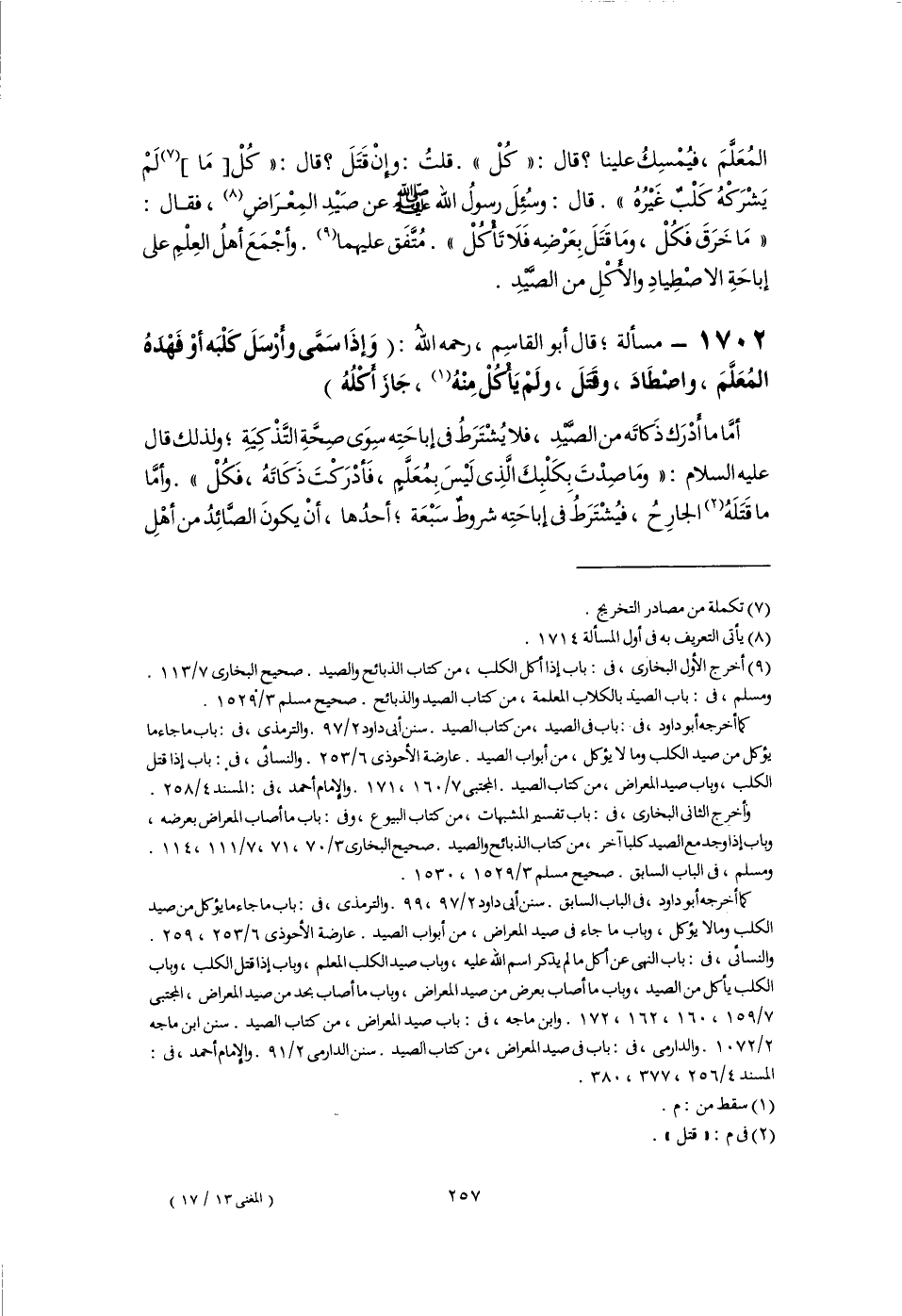 (٩) أخرج الأول البخارى، فى: باب إذا أكل الكلب، من كتاب الذبائح والصيد. صحيح البخارى ٧/ ١١٣. ومسلم، فى: باب الصيد بالكلاب المعلمة، من كتاب الصيد والذبائح. صحيح مسلم ٣/ ١٥٢٩.