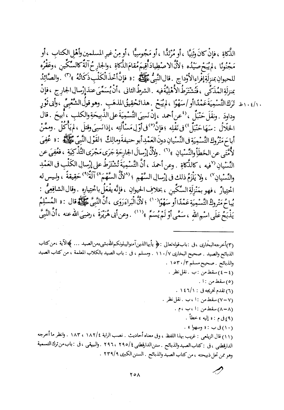 الذَّكاةِ، فإنْ كانَ وثَنِيًّا، أو مُرْتَدًّا، أو مَجُوسِيًّا، أو مِنْ غيرِ المسلمين وأهْلِ الكتابِ، أو مَجْنُونًا، لم يُبَحْ صَيْدُه؛ لأنَّ الاصْطِيادَ أُقِيمَ مُقامَ الذَّكاةِ، والجارِحُ آلةٌ كالسِّكِّينِ، وعَقْرُه للحيوانِ بمنزلَةِ إفْراء الأوْداجِ. قال النَّبِىُّ -صلى اللَّه عليه وسلم-: "فإِنَّ أخْذَ الْكَلْبِ ذَكَاتُهُ" (٣). والصَّائِدُ بمنزلَةِ المُذَكِّى، فتَشْتَرَطُ الأَهْلِيَّةُ فيه. الشرطُ الثانى، أَنْ يُسَمِّىَ عندَ إِرْسالِ الجارِحِ، فإنْ تَرَكَ التَّسْمِيَةَ عَمْدًا أو سَهْوًا، لم يُبَحْ. هذا تَحْقِيقُ المذهَبِ. وهو قولُ الشَّعْبِىِّ، وأبى ثَوْرٍ وداودَ. ونقَلَ حَنْبَلٌ، [عن أحمد، إنْ نَسِىَ التَّسْمِيَةَ على الذَّبِيحَةِ والكلبِ، أُبيحَ. قال الخلّالُ: سَهَا حَنْبَلٌ] (٤) فى نَقْلِه، فإنَّ (٥) فى أوّلِ مَسْأَلَتِه، إذا نَسِىَ وقتلَ، لم يَأْكُلْ. وممَّنْ أباحَ مَتْرُوكَ التَّسْمِيَةِ فى النِّسْيانِ دونَ العَمْدِ أبو حنيفةَ ومالِكٌ، لقَوْلِ النَّبِىِّ -صلى اللَّه عليه وسلم-: "عُفِىَ لأُمَّتَى عن الخَطَأِ والنِّسْيانِ" (٦). ولأنَّ إرْسالَ الجارِحَةِ جَرَى مَجْرَى التَّذْكِيَةِ، فعُفِىَ عن النِّسْيانِ [فيه، كالذَّكاةِ. وعن أحمدَ، أَنَّ التَّسْمِيَةَ تُشْتَرَطُ على إرْسالِ الكَلْبِ فى العَمْدِ والنِّسْيانِ] (٧)، ولا يَلْزَمُ ذلك فى إرْسالِ السَّهْمِ، [لأنَّ السَّهْمَ] (٨) آلةٌ (٩) حَقِيقةً، وليس له اخْتِيارٌ، فهو بمَنْزِلَةِ السِّكِّينِ، بخلافِ الحيوانِ، فإنَّه يفْعَلُ باخْتِيارِه. وقال الشافِعِىُّ: يُباحُ مَتْروكُ التَّسْمِيَةِ عَمْدًا أو سَهْوًا (١٠)؛ لأنَّ الْبَراءَ رَوَى، أَنَّ النَّبِىِّ -صلى اللَّه عليه وسلم- قال: "المُسْلِمُ يَذْبَحُ عَلَى اسْمِ اللَّهِ، سَمَّى أَوْ لَمْ يُسَمِّ" (١١). وعن أبى هُريرَةَ، رَضِىَ اللَّه عنه، أَنَّ النَّبِىِّ