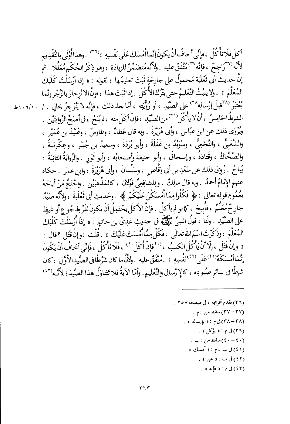 أكلَ فلَا تأْكُلْ، فإنِّى أخافُ أَنْ يكونَ إنَّما أَمْسَكَ عَلَى نَفْسِهِ" (٣٦). وهذا أَوْلَى بالتَّقْدِيمِ لأنَّه [رَاجِحٌ، فإنَّه] (٣٧) مُتَّفَقٌ عليه. ولأنَّه مُتضَمِّنٌ للزيادَةِ، وهو ذِكْرُ الحُكْمِ مُعَلَّلا. ثم إنَّ حديثَ أبى ثَعْلَبَة مَحمولٌ على جارِحَةٍ ثَبَتَ تعليمُها، لقوله: "إذا أرْسَلْتَ كَلْبَكَ المُعَلَّمَ". ولا يثبُتُ التَّعْليمُ حتى يتْرُكَ الأَكْلَ. إذا ثَبَتَ هذا، فإنَّ الانْزِجارَ بالزَّجْرِ إنَّما يُعْتبَرُ [قبلَ إرْسالِه] (٣٨) على الصَّيْدِ، أو رُؤْيَتِه، أمَّا بعدَ ذلك، فإنَّه لا يَنْزَجِرُ بحالٍ. الشرطُ الخامِسُ، أَنْ لا يأْكُلَ (٣٩) من الصَّيْدِ، فإنْ أَكَلَ منه، لم يُبَحْ، فى أصَحِّ الرِّوايتَيْن. ويُرْوَى ذلك عن ابن عبّاس، وأبى هُرَيْرَةَ. وبه قال عَطاءٌ، وطاوسٌ، وعُبَيْدُ بن عُمَيْر، والشَّعْبِىُّ، والنَّخَعِىُّ، وسُوَيْدُ بن غَفَلَةَ، وأبو بُرْدَةَ، وسعيدُ بن جُبَيْر، وعِكْرِمَةُ، والضَّحَّاكُ، وقَتادَةُ، وإسحاقُ، وأبو حنيفةَ وأصحابُه، وأبو ثَوْرٍ. والرِّوايَةُ الثانِيَةُ: يُباحُ. رُوِىَ ذلك عن سَعْدِ بن أبى وَقَّاصٍ، وسَلْمانَ، وأبى هُرَيْرَةَ، وابنِ عمرَ. حكاه عنهم الإِمامُ أحمدُ. وبه قال مالِكٌ. ولِلشافِعِىِّ قَوْلان، كالمَذْهبَيْن. واحْتجَّ مَنْ أباحَهُ بعُمُومِ قولِه تعالى: {فَكُلُوا مِمَّا أَمْسَكْنَ عَلَيْكُمْ}. وحَديثِ أبى ثَعْلَبةَ، ولأنَّه صَيْدٌ جارِحٌ مُعَلَّمٌ، فأُبِيحَ، كما لو لم يأكلْ. فإنَّ الأَكلَ يحْتَمِلُ أَنْ يكونَ لفَرْطِ جُوعٍ أو غيظٍ على الصَّيْدِ. ولَنا، قولُ النبىِّ -صلى اللَّه عليه وسلم- فى حديثِ عَدِىِّ بن حاتمٍ: "إِذَا أُرْسَلْتَ كَلْبَكَ المُعَلَّمَ، وذَكَرْتَ اسْمَ اللَّهِ تعالَى، فَكُلْ مِمَّا أَمسَكَ عَلَيْكَ". قُلْت: وإِنْ قَتَل؟ قال: "وإِنْ قَتَلَ، إلّا أَنْ يَأْكُلَ الكلبُ، [فإنْ أَكلَ] (٤٠)، فَلَا تَأْكُلْ، فَإنِّى أخَافُ أَنْ يَكُونَ إنَّمَا أمْسَكَهُ (٤١) عَلَى (٤٢) نَفْسِهِ". مُتَّفَقٌ عليه. ولأنَّ ما كان شَرْطًا فى الصَّيدِ الأوَّلِ، كان شرطًا فى سائرِ صُيودِه، كالإِرْسالِ والتَّعْليمِ. وأمّا الآيةُ فلا تَتَناوَلُ هذا الصَّيْدَ؛ لأنَّه (٤٣)