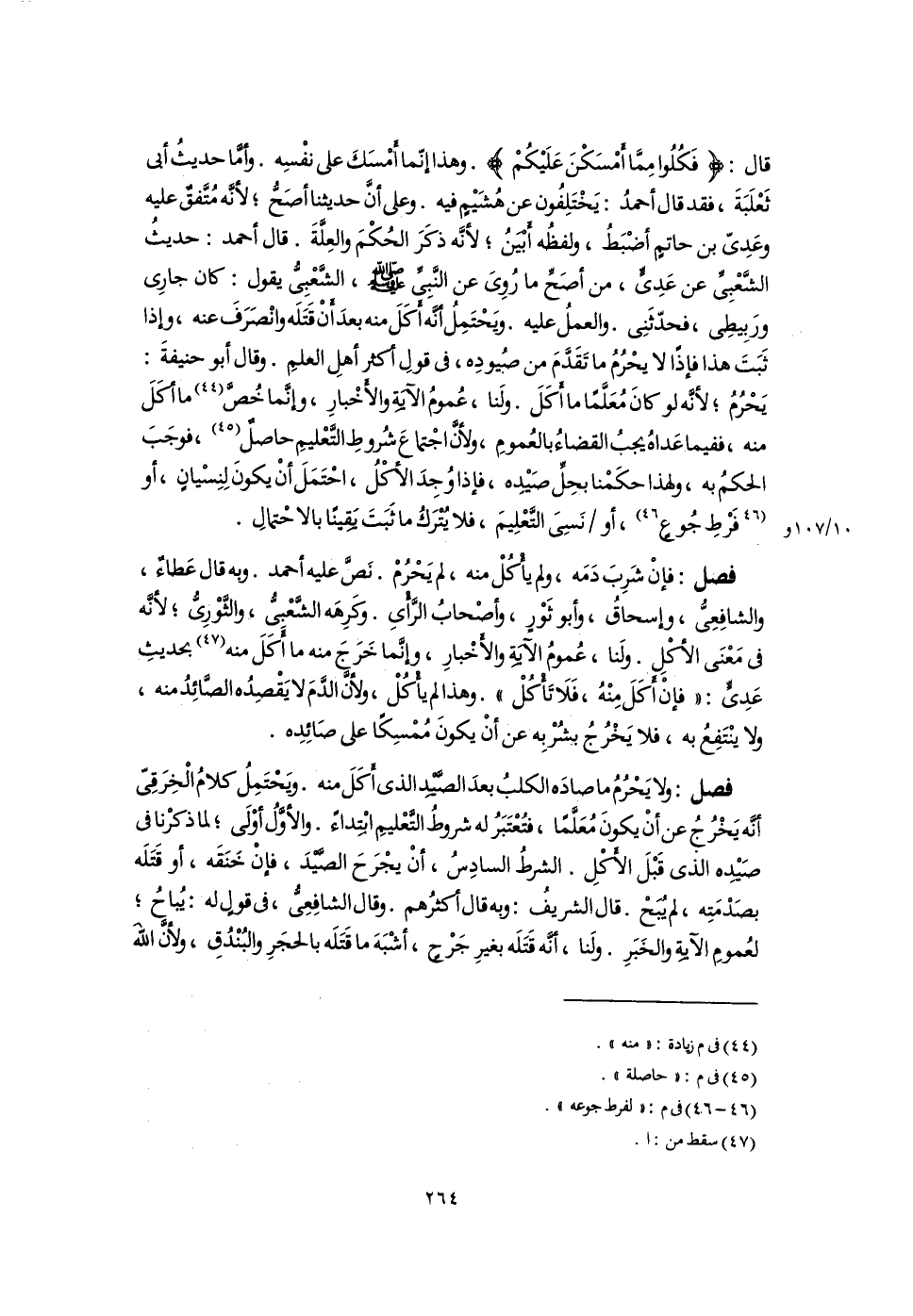 قال: {فَكُلُوا مِمَّا أَمْسَكْنَ عَلَيْكُمْ}. وهذا إنّما أمسَكَ على نفْسِه. وأمَّا حديثُ أبى ثَعْلَبَةَ، فقد قال أحمدُ: يَخْتَلِفُون عن هُشَيْمٍ فيه. وعلى أَنَّ حديثنا أصَحُّ؛ لأنَّه مُتَّفقٌ عليه وعَدِىّ بن حاتمٍ أضْبَطُ، ولفظُه أبْيَنُ؛ لأنَّه ذكَرَ الحُكْمَ والعِلَّةَ. قال أحمد: حديثُ الشَّعْبِىِّ عن عَدِىٍّ، من أصَحِّ ما رُوِىَ عن النَّبِىِّ -صلى اللَّه عليه وسلم-، الشَّعْبِىُّ يقول: كان جارِى ورَبِيطِى، فحدّثَنِى. والعملُ عليه. ويَحْتَمِلُ أنَّه أَكلَ منه بعدَ إنَّ قَتَلَه وانْصَرَفَ عنه، وإذا ثَبَتَ هذا فإذًا لا يحْرُمُ ما تَقَدَّمَ من صيودِه، فى قولِ أكثر أهلِ العلمِ. وقال أبو حنيفةَ: يَحْرُمُ؛ لأنَّه لو كانَ مُعَلَّمًا ما أَكلَ. ولَنا، عُمومُ الآِيَة والأَخْبارِ، وإنَّما خُصَّ (٤٤) ما أكَلَ منه، ففيما عَداهُ يجبُ القضاءُ بالعُمومِ، ولأنَّ اجْتماعَ شُروطِ التَّعْليمِ حاصلٌ (٤٥)، فوجَبَ الحكمُ به، ولهذا حكَمْنا بحِلِّ صَيْدِه، فإذا وُجدَ الأَكْلُ، احْتَمَلَ أَنْ يكونَ لِنِسْيانٍ، أو [فَرْطِ جُوعٍ] (٤٦)، أو نَسِىَ التَّعْلِيمَ، فلا يُتْرَكُ ما ثَبَتَ يَقِينًا بالاحْتمالِ.