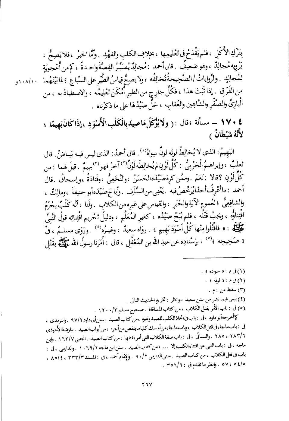 البَهِيمُ: الذى لا يُخالطُ لونَه لونٌ سِواهُ (١). قال أحمدُ: الذى ليس فيه بَياضٌ. قال ثعلبٌ، وإبراهيمُ الْحَرْبِىُّ: كُلُّ لَوْنٍ لم يُخالِطْه لَوْنٌ (٢) آخرُ فهو (٣) بهيمٌ. قيلَ لهما: من كُلِّ لَوْنٍ؟ قالا: نَعَمْ. وممَّن كرِهَ صَيْدَه الحَسَنُ، والنَّخَعِىُّ، وقَتادَةُ، وإسحاقُ. قال أحمد: ما أعْرِفُ أحدًا يُرَخِّصُ فيه. يَعْنِى من السَّلَفِ. وأباحَ صَيْدَه أبو حنيفةَ، ومالِكٌ، والشافِعِىُّ؛ لعُمومِ الآيَةِ والخَبَرِ، والقياسِ على غيرِه من الكلابِ. ولَنا، أنَّه كَلْبٌ يحْرُمُ اقْتِناؤُه، ويجبُ قَتْلُه، فلم يُبَحْ صَيْدُه، كغيرِ المُعَلَّمِ، ودليلُ تَحْريِم اقْتِنائِه قولُ النَّبِىِّ -صلى اللَّه عليه وسلم-: "فاقْتُلُوا مِنْها كُلَّ أسْوَدَ بَهِيمٍ". روَاه سعير، وغيرُه (٤). ورَوَى مسلمٌ، فى "صَحِيحِه" (٥)، بإسْنادِه عن عبدِ اللَّه بن المُغَفَّلِ، قال: أَمرَنا رسولُ اللَّه -صلى اللَّه عليه وسلم- بقَتْلِ