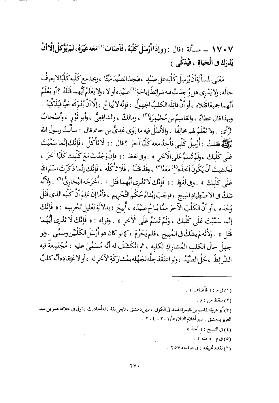 مَعْنَى المسألَةِ أَنْ يُرْسِلَ كَلْبَه على صَيْدٍ، فيَجِدَ الصَّيدَ مَيِّتًا، ويجدَ مع كَلْبِه كَلْبًا لا يعرفُ حالَه، ولا يَدْرِى هل وُجدَتْ فيه شرائِطُ إباحَةِ (٢) صَيْدِه أو لا، ولا يَعْلَمُ أيُّهما قَتَلَهُ؟ أو يَعْلَمُ أنَّهما جميعًا قَتَلاه، أو أَنَّ قاتِلَه الكلبُ المجهولُ، فإنَّه لا يُباحُ؛ إلَّا أَنْ يُدْرِكَه حَيًّا فيُذَكِّيَهُ. وبهذا قال عطاءٌ، والقاسِمُ بن مُخَيْمِرَةَ (٣)، ومالكٌ، والشافِعِىُّ، وأبو ثَوْرٍ، وأصْحابُ الرَّأْىِ. ولا نَعْلَمُ لهم مخالِفًا. والأصْلُ فيه ما رَوَى عَدِىُّ بن حاتم قال: سأَلْتُ رسولَ اللَّه -صلى اللَّه عليه وسلم- فقلتُ: أُرْسِلُ كَلْبِى فأَجِدُ معه كَلْبًا آخرَ؟ قال: "لَا تَأْكُلْ، فَإِنَّكَ إِنَّما سَمَّيْتَ عَلَى كَلْبِكَ، ولَمْ تُسَمِّ عَلَى الآخَرِ". وفى لفظ: "فَإِنْ وَجَدْتَ مَعَ كَلْبِك كَلْبًا آخَرَ، فَخَشِيتَ أَنْ يَكُونَ أَخَذَه (٤) مَعَهُ (٥)، وقَدْ قَتَلَهُ، فَلَا تَأْكُلْه، فَإِنَّك إنَّما ذَكَرْتَ اسْمَ اللَّهِ عَلَى كَلْبِكَ". وفى لفْظٍ: "فَإِنَّكَ لَا تَدْرِى أيُّهما قَتَل". أَخْرَجَه البُخارِىُّ (٦). ولأنَّه شَكَّ فى الاصْطِيادِ المبيحِ، فوجَبَ إبْقاءُ حُكْمِ التَّحْرِيمِ، فأمَّا إنْ عَلِمَ أَنَّ كَلْبَه الذى قَتَلَ وَحْدَه، أو أَنَّ الكَلْبَ الآخرَ ممَّا يُباحُ صَيْدُه، أُبِيحَ، بدلالَةِ تَعْليلِ تَحْرِيمِه: "فَإِنَّكَ إنَّما سَمَّيْتَ عَلَى كَلْبِكَ، وَلَم تُسَمِّ عَلَى الْآخَرِ". وقولِه: "فَإِنَّكَ لَا تَدْرِى أَيُّهُما قَتَل". ولأنَّه لم يشُكَّ فى المُبِيحِ، فلم يَحْرُمْ، كما لو كان هو أرْسَلَ الكَلْبَيْن وسَمَّى. ولو جهلَ حالَ الكلبِ المُشارِكِ لكلبِه، ثم انْكَشَفَ له أنَّه مُسَمًّى عليه، مُجْتَمِعةٌ فيه الشَّرائِطُ، حَلَّ الصَّيْدُ، ولو اعتَقَدَ حِلَّه لجهْلِه بمُشارَكَةِ الآخَرِ له، أو لاعْتِقادِه أنَّه كلبٌ