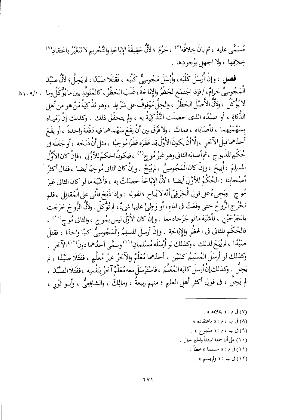 فصل: وإِنْ أُرسَلَ كَلْبَه، وأَرْسَلَ مَجُوسِىٌّ كَلْبَه، فَقَتَلَا صَيْدًا، لم يَحِلَّ؛ لأنَّ صَيْدَ الْمَجُوسِىِّ حَرامٌ، فإذا اجْتَمَعَ الحَظْرُ والإِباحَةُ، غَلَبَ الحَظْرُ، كالمُتَوِّلدِ بين ما يُؤْكَلُ وما لا يُؤْكَلُ، ولأنَّ الأصْلَ الحَظْرُ، والحِلُّ مَوْقوفٌ على شَرْطٍ، وهو تَذْكِيَةُ مَنْ هو من أهلِ الذَّكاةِ، أو صَيْدُه الذى حصلَت التَّذْكِيَةُ به، ولم يتحقّقْ ذلك. وكذلك إنْ رَمَياه بسَهْمَيْهما، فأصَاباه، فماتَ، ولا فَرْقَ بين أَنْ يقَعَ سَهْماهما فيه دَفْعَة واحدةً، أو يقَعَ أَحدُهما قبلَ الآخَرِ، إلَّا أَنْ يكونَ الأوَّلُ قد عَقَرَه عَقْرًا مُوحِيًا، مثل أَنْ ذَبَحَه، أو جَعَلَه فى حُكْمِ المذْبوحِ، ثم أصابَه الثانى وهو غيرُ مُوحٍ (٩)، فيكونُ الحكمُ للأوَّلِ، فإنْ كان الأوَّلُ المسلِمَ، أُبِيحَ، وإِنْ كان الْمَجُوسِىَّ، لم يُبَحْ. وإِنْ كان الثانى مُوحِيًا أيضًا، فقال أكثرُ أصْحابِنا: الحُكْمُ للأوَّلِ أيضًا؛ لأنَّ الإِباحَةَ حصَلتْ به، فأشْبَهَ ما لو كان الثانى غيرَ مُوحٍ. ويَجِىءُ على قولَ الْخِرَقِىّ أنَّه لا يُباح؛ لقولِه: وإذا ذَبح فأَتى على الْمَقاتِلِ، فلم تخْرُج الرُّوحُ حتى وقَعَتْ فى الماءِ، أو وَطِئَ عليها شىءٌ، لم تُؤْكلْ. ولأنَّ الرُّوحَ خَرَجَت بالجَرْحَيْنِ، فأشْبَهَ ما لو جَرَحاه معا. وإِنْ كان الأوّلُ ليس بمُوحٍ، والثانى مُوحٍ (١٠)، فالحُكْم للثانى فى الحظْرِ والإِباحَةِ. وإِنْ أرسلَ المسلِمُ والْمَجُوسِىُّ كلبًا واحدًا، فقتلَ صَيْدًا، لم يُبَحْ لذلك، وكذلك لو أَرْسَلَه مُسْلمانِ (١١) وسمَّى أحدُهما دونَ (١٢) الآخَرِ. وكذلك لو أرسَلَ المُسْلِمُ كلبَيْن، أحدُهما مُعَلَّمٌ والآخَرُ غيرُ مُعلَّمٍ، فقَتَلَا صَيْدًا، لم يَحِلَّ. وكذلك إنْ أرسلَ كلبَه المُعَلَّمَ، فاسْتَرْسَلَ معه مُعَلَّمٌ آخَرُ بِنَفْسِه، فقَتَلَا الصَّيْدَ، لم يَحِلُّ، فى قولِ أكثرِ أهلِ العلمِ؛ منهم ربيعةُ، ومالِكٌ، والشافِعِىُّ، وأبو ثَوْرٍ،