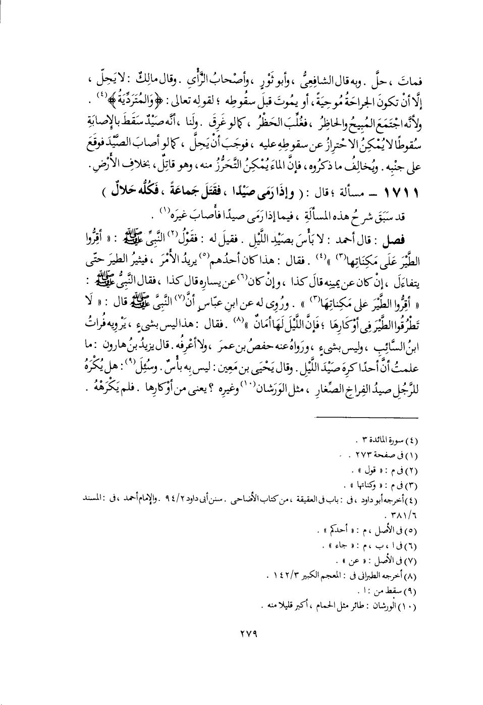 فصل: قال أحمد: لا بَأْسَ بصَيْدِ اللَّيْلِ. فقيلَ له: فقَوْلُ (٢) النَّبِىِّ -صلى اللَّه عليه وسلم-: "أقِرُّوا الطَّيْرَ عَلَى مَكِنَاتِها (٣) " (٤). فقال: هذا كان أحدُهم (٥) يريدُ الأَمْرَ، فيثيرُ الطيرَ حتَّى يتفاءَلَ، إِنْ كان عن يَمينِه قال كذا، وإِنْ كان (٦) عن يسارِه قال كذا، فقال النَّبِىُّ -صلى اللَّه عليه وسلم-: "أقِرُّوا الطَّيْرَ على مَكِناتِهَا (٣) ". ورُوِى له عن ابنِ عبَّاسٍ أَنَّ (٧) النَّبِىَّ -صلى اللَّه عليه وسلم- قال: "لَا تَطْرُقُوا الطَّيْرَ فِى أوْكَارِهَا، فَإنَّ اللَّيْلَ لَهَا أمَانٌ" (٨). فقال: هذا ليس بشىءٍ، يَرْوِيه فُراتُ ابنُ السَّائِبِ، وليس بشىءٍ، ورَواهُ عنه حفصُ بن عمرَ، ولا أعْرِفُه. قال يزيدُ بنُ هارون: ما علمتُ أَنَّ أحدًا كرِهَ صَيْدَ اللَّيْلِ. وقال يَحْيَى بن مَعِين: ليس بِه بأْسٌ. وسُئِلَ (٩): هل يُكْرَهُ للرَّجُلِ صيدُ الفِراخِ الصِّغارِ، مثل الوَرَشان (١٠) وغيرِه؟ يعنى من أوْكارِها. فلم يَكْرَهْهُ.