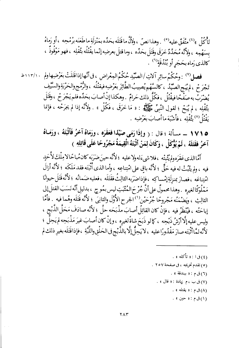 فصل (٧): وحُكْمُ سائِرِ آلاتِ الصَّيْدِ حُكْمُ المِعْراضِ، فى أَنَّها إذا قَتَلَتْ بعَرْضِها ولم تَجْرَحْ، لم يُبَحِ الصَّيْدُ، كالسَّهْمِ يُصِيبُ الطَّائِرَ بعَرْضِه فيقتُلُه، والرُّمْحِ والحَرْبَةِ والسَّيْفِ يُضْرَبُ به صَفْحًا فيقْتُلُ، فكُلُّ ذلك حَرامٌ. وهكذا إنْ أصابَ بحَدِّه فلم يَجْرَحْ، وقَتَلَ بثُقْلِه، لم يُبَحْ؛ لقولِ النَّبِىِّ -صلى اللَّه عليه وسلم-: "مَا خَرَقَ، فَكُلْ". ولأنَّه إذا لم يجرَحْه، فإنَّما يَقْتُلُ (٨) بثُقْلِه، فأشْبَهَ ما أصابَ بعَرْضِه.
