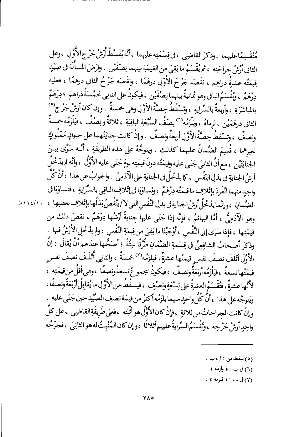 مُنْقَسِمًا عليهما. وذكرَ القاضِى، فى قِسْمَتِه عليهما، أَنَّه يُقَسَّطُ أَرْشُ جَرْحِ الأَوَّلِ، وعلى الثانى أَرْشُ جِراحَتِه، ثمَّ يُقْسَمُ ما بَقِىَ من القيمَةِ بينهما نِصْفَيْن. وفرَضَ المسأَلَةَ فى صَيْدٍ قِيمَتُه عشرةُ دراهِم، نقَصَه جَرْحُ الأَوَّلِ درهَمًا، ونقَصَه جَرْحُ الثانى درهمًا، فعليه دِرْهَمٌ، ويُقْسَمُ الباقى وهو ثمانيةٌ بينهما نِصْفَيْن، فيكونُ على الثانِى خَمْسَةُ دَراهمَ؛ دِرْهَمٌ بالمباشَرَةِ، وأربعةٌ بالسِّرايَةِ، وتَسْقُطُ حِصَّةُ الأوَّلِ وهى خمسةٌ. وإن كان أرشُ جَرْحِ (٥) الثانى درهَمَيْن، لزِماهُ، ويَلْزَمُه (٦) نِصْفُ السَّبْعَةِ الباقِيَةِ، ثلاثةٌ ونِصْف، فيَلْزَمُه خمسةٌ ونصفٌ، وتسْقطُ حِصَّةُ الأَوَّلِ أربعةٌ ونصفٌ. وإِنْ كانت جِنايَتُهما على حيوانٍ مَمْلُوكٍ لغيرِهما، قُسِمَ الضَّمانُ عليهما كذلك. ويتوجَّهُ على هذه الطريقَةِ، أنَّه سَوَّى بينَ الجنايَتَيْن، مع أنَّ الثانىَ جَنَى عليه وقيمَتُه دونَ قيمَتِه يومَ جَنَى عليه الأَوَّلُ، وأنَّه لم يدْخُلْ أرشُ الجنايَةِ فى بدَلِ النَّفْسِ، كما يدْخُلُ فى الجنايَةِ على الآدَمِىّ. والجوابُ عن هذا، أَنَّ كُلَّ واحِدٍ منهما انْفَردَ بإتْلافِ ما قيمَتُه دِرْهَمٌ، وتَساوَيَا فى إتْلافِ الباقِى بالسِّرَايةِ، فتساوَيَا فى الضَّمانِ، وإنَّما يدْخُلُ أرشُ الجنايَةِ فى بدلِ النَّفْسِ التى لا ينْقُصُ بَدَلُها بإتْلافِ بعضِها، وهو الآدَمِىُّ، أَمَّا البهائمُ، فإنَّه إذا جَنَى عليها جِنايةً أرْشُها دِرْهَمٌ، نقصَ ذلك من قيمَتِها، فإذا سَرَى إلى النَّفْس، أَوْجَبْنَا ما بَقِىَ من قِيمَةِ النَّفْسِ، ولم يدْخُلِ الأَرْشُ فيها. وذكرَ أصحابُ الشافِعِىِّ فى قِسْمةِ الضَّمَانِ طُرْقًا سِتَّةً؛ أصَحُّها عندَهم أَنْ يُقالَ: إنَّ الأَوَّلَ أَتْلَفَ نصفَ نفسٍ قيمتُها عشرةٌ، فيلزَمُه (٧) خمسَةٌ، والثانِى أَتْلَفَ نصفَ نفسٍ قيمَتُها تسعةٌ، فيَلْزَمُه أرَبعَةٌ ونصفٌ، فيكونُ المجموعُ تسعةً ونصفًا، وهى أقلُّ منٍ قيمَتِه، لأنَّها عشرةٌ، فتُقْسَمُ العشرةُ على تِسْعَةٍ ونصْفٍ، فيسقُطُ عن الأَوَّلِ ما يُقابِلُ أَرْبَعَة ونصفًا، ويَتوجَّه على هذا، أنَّ كُلَّ واحدٍ منهما يلزَمُه أَكْثَرُ من قيمَةِ نصفِ الصَّيْد حين جَنَى عليه. وإِنْ كانت الجِراحاتُ من ثلاثةٍ، فإنْ كان الأَوَّل هو أثْبَتَه، فعلى طَرِيقَةِ القاضِى، على كلِّ واحِدٍ أرشُ جَرْحِه، وتُقْسَمُ السِّرايةُ عليهم أثلاثًا، وإن كان المُثْبِتُ له هو الثانِىَ، فجَرْحُه