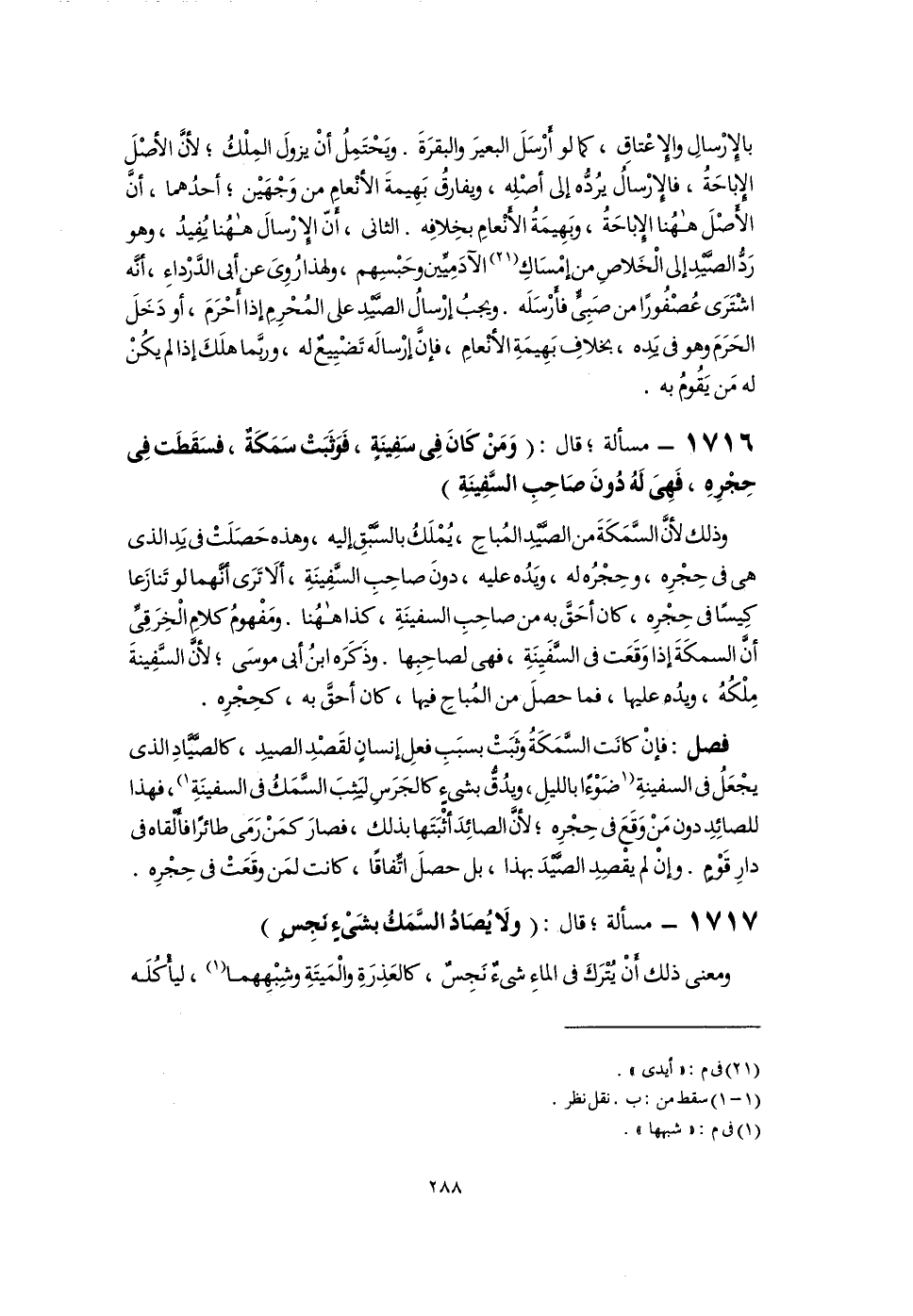 بالإِرْسالِ والإِعْتاقِ، كما لو أَرْسَلَ البعيرَ والبقرَةَ. ويَحْتَمِلُ أَنْ يزولَ المِلْكُ؛ لأنَّ الأصْلَ الإِباحَةُ، فالإِرْسالُ يرُدُّه إلى أصْلِه، ويفارقُ بَهِيمةَ الأنْعام من وَجْهَيْن؛ أحدُهما، أَنَّ الأَصْلَ ههُنا الإِباحَةُ، وبَهِيمَةُ الأَنْعامِ بخِلافِه. الثانى، أَنَّ الإِرْسالَ ههُنا يُفِيدُ، وهو رَدُّ الصَّيْدِ إلى الْخَلاصِ من إِمْسَاكِ (٢١) الآدَمِيِّين وحَبْسِهم، ولهذا رُوِىَ عن أبى الدَّرْدَاءِ، أَنَّه اشْتَرَى عُصْفورًا من صَبِىٍّ فأَرْسَلَه. ويجبُ إرْسالُ الصَّيْدِ على المُحْرِمِ إذا أَحْرَمَ، أو دَخَلَ الحَرَمَ وهو فى يَدِه، بخلافِ بَهِيمَةِ الأنعامِ، فإنَّ إرْسالَه تَضْيِيعٌ له، وربَّما هلَكَ إذا لم يكُنْ له مَن يَقُومُ به.