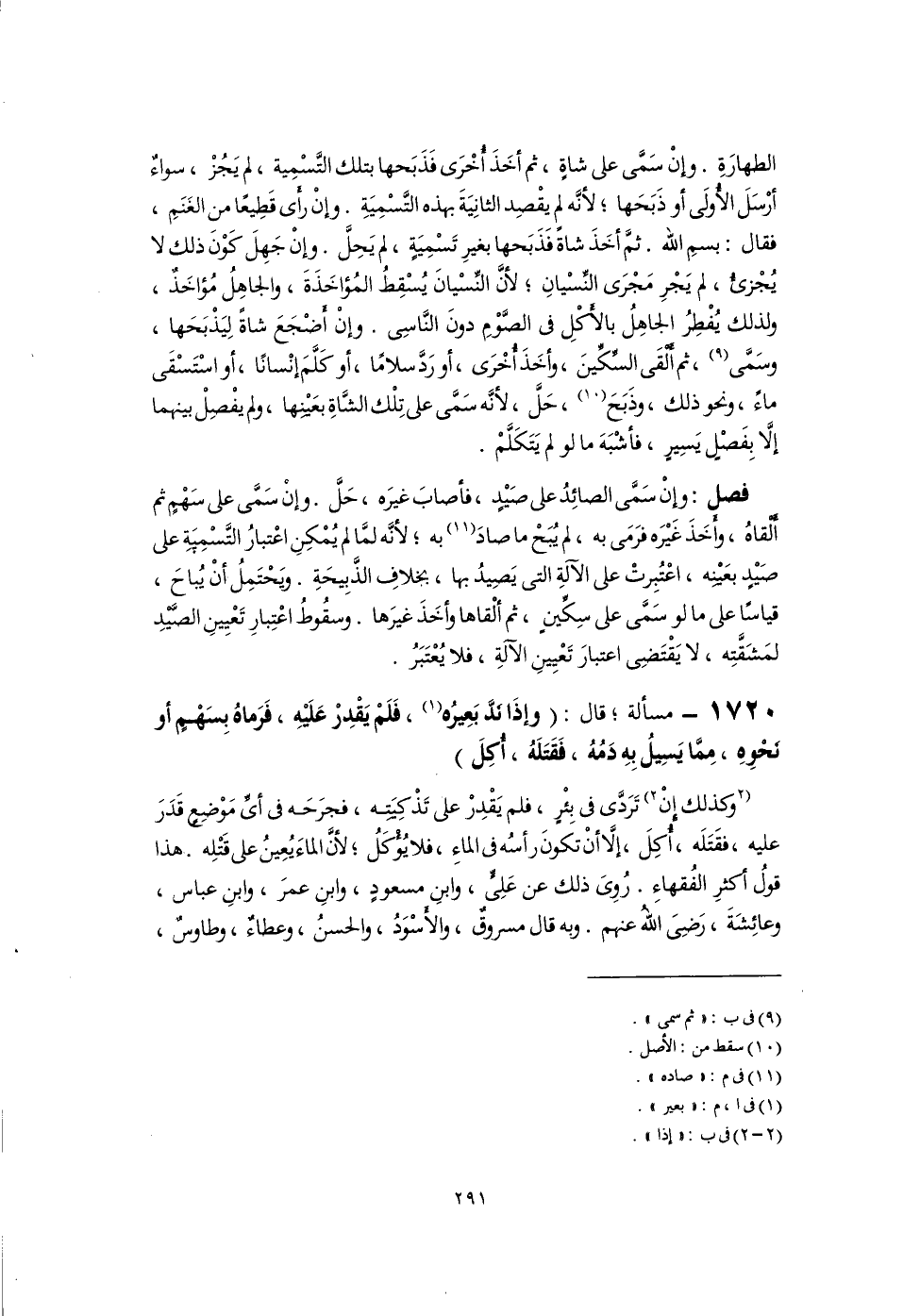 الطهارَةِ. وإِنْ سَمَّى على شاةٍ، ثمَّ أخَذَ أُخْرَى فَذَبَحها بتلك التَّسْمِية، لم يَجُزْ، سواءٌ أَرْسَلَ الأُولَى أو ذَبَحَها، لأنَّه لم يقْصِد الثانِيَةَ بهذه التَّسْمِيَةِ. وإِنْ رأى قَطِيعًا منِ الغَنَمِ، فقال: بسمِ اللَّه. ثمَّ أخَذَ شاةً فَذَبَحها بغيرِ تَسْمِيَةٍ، لم يَحِلَّ. وإِنْ جَهِلَ كَوْن ذلك لا يُجْزئُ، لم يَجْرِ مَجْرَى النِّسْيانِ؛ لأنَّ النِّسْيانَ يُسْقِطُ المُؤاخَذَةَ، والجاهِلُ مُؤاخَذٌ، ولذلك يُفْطِرُ الجاهِلُ بالأَكْلِ فى الصَّوْمِ دونَ النَّاسِى. وإِنْ أَضْجَعَ شاةً لِيَذْبَحَها، وسَمَّى (٩)، ثمَّ أَلْقَى السِّكِّينَ، وأخَذَ أُخْرَى، أو رَدَّ سلامًا، أو كَلَّمَ إنْسانًا، أو اسْتَسْقَى ماءً، ونحو ذلك، وذَبَحَ (١٠)، حَلَّ؛ لأنَّه سَمَّى على تِلْك الشَّاةِ بعَيْنِها، ولم يفْصِلْ بينهما إلَّا بِفَصْلٍ يَسِيرٍ، فأشْبَهَ ما لو لم يَتَكَلَّمْ.