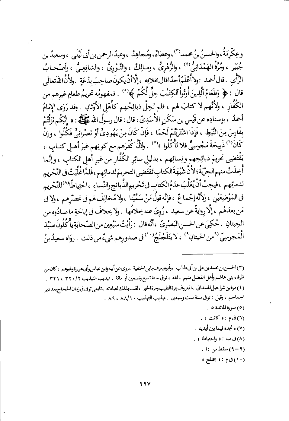 وعِكْرِمَةُ، والحسنُ بنُ محمد (٣)، وعطاءٌ، ومُجاهِدٌ، وعبدُ الرحمن بن أبى لَيْلَى، وسعيدُ بن جُبَيْر، ومُرَّةُ الهَمْدَانِىُّ (٤)، والزُّهْرِىُّ، ومالِكٌ، والثَّوْرِىُّ، والشافِعِىُّ، وأصْحابُ الرَّأْىِ. قال أحمد: ولا أَعْلَمُ أحدًا قال بخلافِه، إلَّا أَنْ يكونَ صاحِبَ بِدْعَةٍ. ولأنَّ اللَّهَ تَعالَى قال: {وَطَعَامُ الَّذِينَ أُوتُوا الْكِتَابَ حِلٌّ لَكُمْ} (٥). فمفهومُه تحريمُ طعامِ غيرِهم من الكُفَّارِ، ولأنَّهم لا كتابَ لهم، فلم تَحِلُّ ذبائِحُهم كأَهْلِ الأَوْثانِ. وقد رَوَى الإِمامُ أحمدُ، بإسنادِه عن قَيْس بن سَكَنٍ الأَسَدِىّ، قال: قال رسولُ اللَّه -صلى اللَّه عليه وسلم-: "إِنَّكُمْ نَزَلْتُمْ بِفَارِسَ مِنَ النَّبَطَ، فَإذَا اشْتَرَيْتُمْ لَحْمًا، فَإِنْ كَانَ مِنْ يَهُودِىٍّ أَوْ نَصْرانِىٍّ فَكُلُوا، وإِنْ كَانَ (٦) ذَبِيحَةَ مَجُوسِىٍّ فلا تَأْكُلُوا" (٧). ولأنَّ كُفْرَهم مع كونِهم غيرَ أهلِ كتابٍ، يَقْتَضِى تحريمَ ذبائِحِهم ونِسائِهم، بدليلِ سائِرِ الكُفَّارِ من غيرِ أهلِ الكتابِ، وإنَّما أُخِذَتْ منهم الجِزْيَةُ؛ لأنَّ شُبْهَةَ الكتابِ تَقْتَضِى التحريمَ لدمائِهِم، فَلمَّا غُلِّبَتْ فى التَّحْريمِ لدمائِهم، فيجِبُ أَنْ يُغَلَّبَ عدَمُ الكتابِ فى تَحْريمِ الذَّبائحِ والنِّساءِ، احْتِياطًا (٨) للتَّحْريِم فى المَوْضِعَيْنِ، ولأنَّه إجْماعٌ، فإنَّه قولُ مَنْ سَمَّيْنا، ولا مُخالِفَ لهم فى عَصْرهم، ولا فى مَن بعدَهُم، إلَّا رِوايةً عن سعيد، رُوِىَ عنه خِلافُها. ولا خِلافَ فى إباحَةِ ما صادُوه من الحِيتانِ. حُكِىَ عن الحسنِ البَصْرِىّ، أَنَّه قال: رَأَيتُ سَبْعِين من الصّحابَةِ يأْكُلُونَ صَيْدَ الْمَجوسِىّ [من الحيتانِ] (٩)، لا يتَلَجْلَجُ (١٠) فى صدورِهم شىءٌ من ذلك. روَاه سعيدُ بنُ