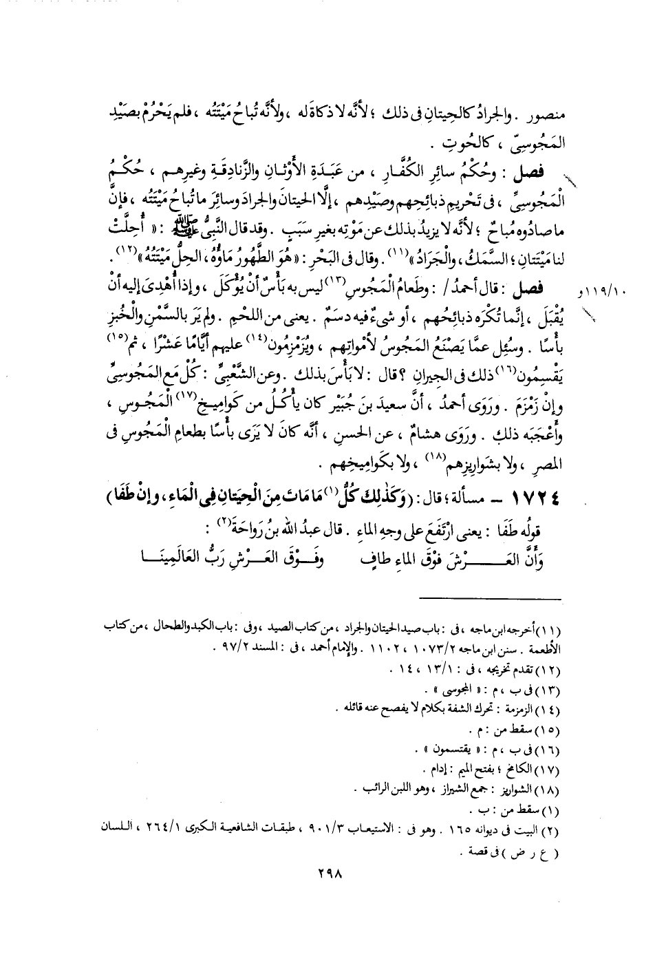 (١١) أخرجه ابن ماجه، فى: باب صيد الحيتان والجراد، من كتاب الصيد، وفى: باب الكبد والطحال، من كتاب الأطعمة. سنن ابن ماجه ٢/ ١٠٧٣، ١١٠٢. والإِمام أحمد، فى: المسند ٢/ ٩٧.