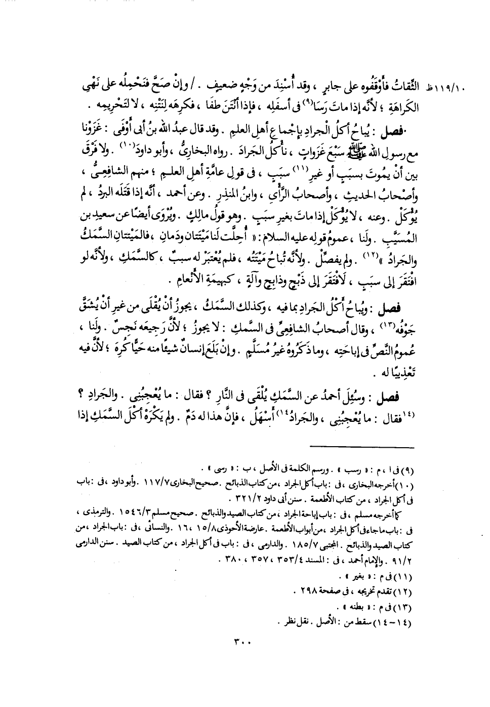 فصل: يُباحُ أكلُ الْجرادِ بإِجْماعِ أهلِ العلمِ. وقد قال عبدُ اللَّه بنُ أبى أَوْفَى: غَزَوْنا مع رسولَ اللَّه -صلى اللَّه عليه وسلم- سَبْعَ غَزَواتٍ، نَأْكلُ الجَرادَ. رواه البخارِىُّ، وأبو داودَ (١٠). ولا فَرْقَ بين أَنْ يمُوتَ بسبَبٍ أو غيرِ (١١) سبَبٍ، فى قولِ عامَّةِ أهلِ العلمِ؛ منهم الشافِعِىُّ، وأصْحابُ الحديثِ، وأصحابُ الرَّأْىِ، وابنُ المنذِرِ. وعن أحمد، أنَّه إذا قَتَلَه البردُ، لم يُؤْكَلْ. وعنه، لا يُؤْكَلْ إذا ماتَ بغيرِ سبَبٍ. وهو قولُ مالِكٍ. ويُرْوَى أيضًا عن سعيدِ بن المُسَيَّبِ، ولَنا، عمومْ قولِه عليه السلام: "أُحِلَّت لَنا مَيْتَتان ودَمانِ، فالمَيْتتانِ السَّمَكُ والجَرادُ " (١٢). ولم يفصِّلْ. ولأنَّه تُباحُ مَيْتَتُه، فلم يُعْتبَرْ له سببٌ، كالسَّمَكِ، ولأنَّه لو افْتَقَرَ إلى سبَبٍ، لَافْتَقَرَ إلى ذَبْحٍ وذابِحٍ وآلةٍ، كبهيمَةِ الأَنْعامِ.