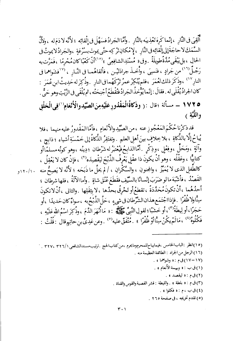 أُلْقِىَ فى النَّارِ، إِنَّما كَرِهَ تَعْذِيبَه بالنَّارِ. وأمَّا الجَرادُ فسَهَّلَ فى إِلْقائِه؛ لأنَّه لا دَمَ له، ولأنَّ السَّمَكَ لا حاجَةَ إلى إلْقائِه فى النَّارِ، لإِمْكانِ تَرْكِه حتَّى يموتَ بسُرْعَةٍ، والجَرادُ لا يموتُ فى الحالِ، بل يَبْقَى مُدَّةً طويلَةً. وفى "مُسْنَدِ الشافِعِىِّ" (١٥) أنّ كَعْبًا كان مُحْرِمًا، فَمَرَّت به رَجْلٌ (١٦) من جَرادٍ، فنَسِىَ، وأَخَذَ جرادَتَيْن، فأَلقاهُما فى النَّارِ، [فشَواهما فى النارِ] (١٧)، وذَكَرَ ذلك لعُمَرَ، فلم يُنْكِرْ عمرُ تَرْكَهُما فى النارِ. وذُكِرَ له حَدِيثُ ابنِ عُمَرَ: كان الجرادُ يُقْلَى له. فقالَ: إنّما يُؤْخَذُ الجَرادُ فتُقْطَعُ أجْنِحَتُه، ثمَّ يُلْقَى فى الزَّيْتِ وهو حَىٌّ.