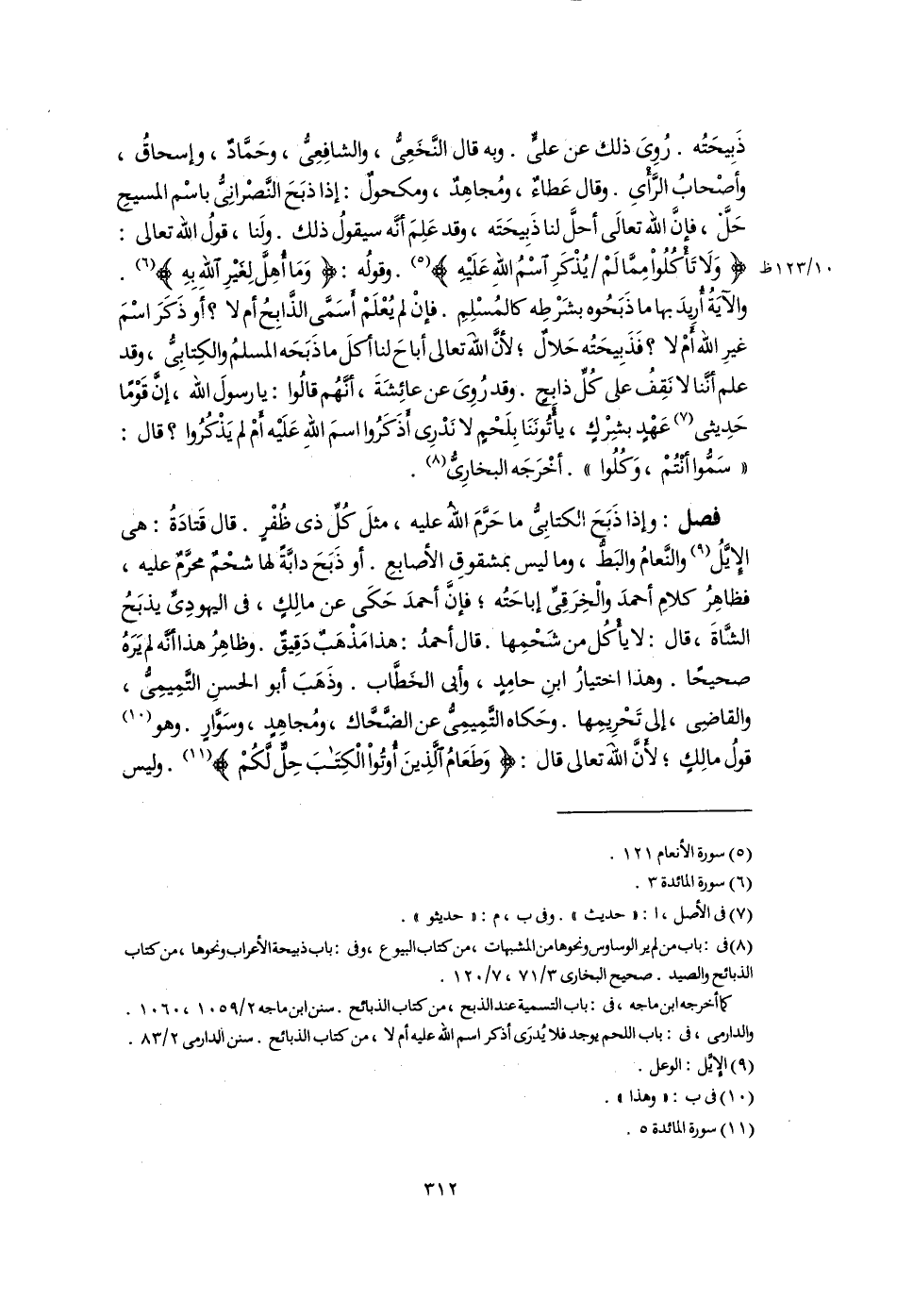 ذَبيحَتُه. رُوِىَ ذلك عن علىٍّ. وبه قال النَّخَعِىُّ، والشافِعِىُّ، وحَمَّادٌ، وإسحاقُ، وأصحابُ الرَّأْىِ. وقال عَطاءٌ، ومُجاهِدٌ، ومكحولٌ: إذا ذبَحَ النَّصْرانِىُّ باسْم المسيحِ حَلَّ، فإنَّ اللَّه تعالَى أحلَّ لنا ذَبِيحَتَه، وقد عَلِمَ أَنَّه سيقولُ ذلك. ولَنا، قولُ اللَّه تعالى: {وَلَا تَأْكُلُوا مِمَّا لَمْ يُذْكَرِ اسْمُ اللَّهِ عَلَيْهِ} (٥). وقولُه: {وَمَا أُهِلَّ لِغَيْرِ اللَّهِ بِهِ} (٦). والآيَةُ أُريدَ بها ما ذَبَحُوه بشَرْطِه كالمُسْلِمِ. فإنْ لم يُعْلَمْ أَسَمَّى الذّابِحُ أم لا؟ أو ذَكَرَ اسْمَ غيرِ اللَّه أَمْ لا؟ فَذَبِيحَتُه حَلالٌ؛ لأنَّ اللَّهَ تعالى أباحَ لنا أَكلَ ما ذَبَحَه المسلمُ والكِتابِىُّ، وقد علم أَنَّنا لا نَقِفُ على كُلِّ ذابحٍ. وقد رُوِىَ عن عائِشَةَ، أنَّهُم قالُوا: يا رسولَ اللَّه، إنَّ قَوْمًا حَدِيثى (٧) عَهْدٍ بشِرْكٍ، يأْتُونَنَا بِلَحْمٍ لا نَدْرِى أَذكَرُوا اسمَ اللَّهِ عَلَيْه أَمْ لم يَذْكُرُوا؟ قال: "سَمُّوا أَنْتُمْ، وَكُلُوا". أخْرَجَه البخارِىُّ (٨).