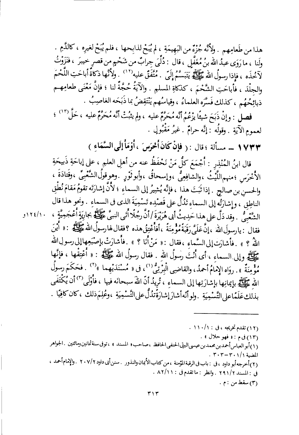 فصل: وإِنْ ذَبَحَ شيئًا يزْعُمُ أَنَّه مُحَرَّمٌ عليه، ولم يثبُتْ، أَنَّه مُحَرَّمٌ عليه، حَلَّ (١٣)؛ لعمومِ الآيَةِ. وقولُه: إنَّه حرامٌ. غيرُ مَقبُولٍ.