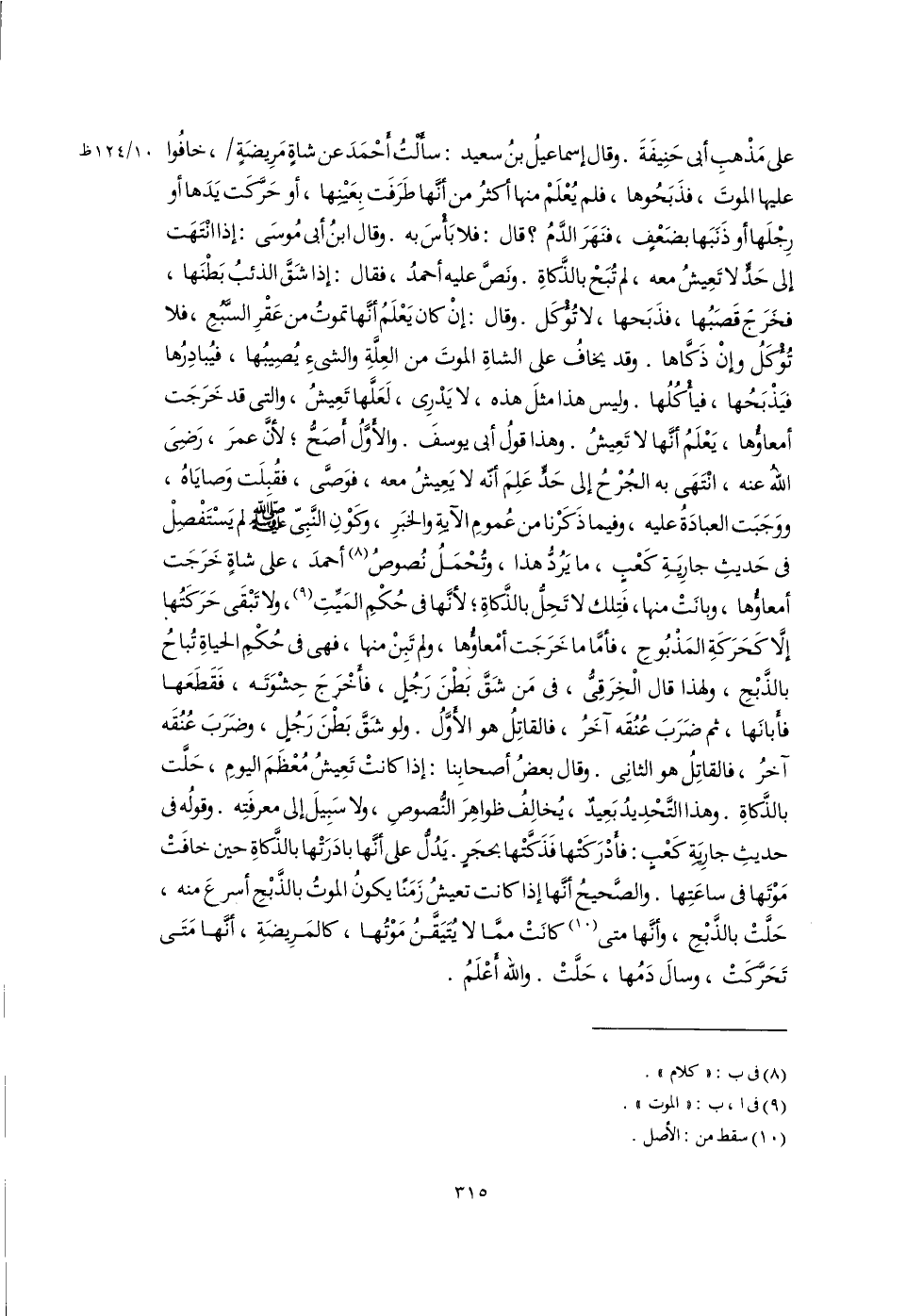 على مَذْهبِ أبى حَنِيفَةَ. وقال إسماعيلُ بنُ سعيد: سأَلْتُ احْمَدَ عن شاةٍ مَرِيضَةٍ، خافُوا عليها الموتَ، فذَبَحُوها، فلم يُعْلَمْ منها أَكْثَرُ من أَنَّها طَرَفَت بِعَيْنِها، أو حَرَّكَت يَدَها أو رِجْلَها أو ذَنَبَها بضَعْفٍ، فنَهَرَ الدَّمُ؟ قال: فلا بَأْسَ به. وقال ابنُ أبى مُوسَى: إذا انْتَهَت إلى حَدٍّ لا تَعِيشُ معه، لم تُبَحْ بالذَّكاةِ. ونَصَّ عليه أحمدُ، فقال: إذا شَقَّ الذئبُ بَطْنَها، فخَرَجَ قَصَبُها، فذَ بَحها، لا تُؤْكَل. وقال: إنْ كان يَعْلَمُ أَنَّها تموتُ من عَقْرِ السَّبُعِ، فلا تُؤْكَلُ وإِنْ ذَكَّاها. وقد يخافُ على الشاةِ الموتَ من العِلَّةِ والشىءِ يُصِيبُها، فيُبادِرُها فيَذْبَحُها، فيأْكُلُها. وليس هذا مثلَ هذه، لا يَدْرِى، لَعَلَّها تَعِيشُ، والتى قد خَرَجَت أمعاؤُها، يَعْلَمُ أنَّها لا تَعِيشُ. وهذا قولُ أبى يوسفَ. والأَوَّلُ أَصَحُّ؛ لأنَّ عمرَ، رَضِىَ اللَّهُ عنه، انْتَهَى به الجُرْحُ إلى حَدٍّ عَلِمَ أنَّه لا يَعِيشُ معه، فوَصَّى، فقُبلَت وَصايَاهُ، ووَجَبَت العبادَةُ عليه، وفيما ذَكَرْنا من عُمومِ الآيةِ والخبَرِ، وكَوْنِ النَّبِىّ -صلى اللَّه عليه وسلم- لم يَسْتَفْصِلْ فى حَديثِ جارِيَةِ كَعْبٍ، ما يَرُدُّ هذا، وتُحْمَلُ نُصوصُ (٨) أحمدَ، على شاةٍ خَرَجَت أمعاؤُها، وبانَتْ منها، فَتِلك لا تَحِلُّ بالذَّكاة؛ لأنَّها فى حُكْمِ المَيِّتِ (٩)، ولا تَبْقَى حَرَكَتُه! إلَّا كَحَرَكَةِ المَذبُوحِ، فأمَّا ما خَرَجَت أمْعاؤُها، ولم تَبِنْ منها، فهى فى حُكْمِ الحياةِ تُباحُ بالذَّبْحِ، ولهذا قال الْخِرَقِىُّ، فى مَن شَقَّ بَطْنَ رَجُلٍ، فأَخْرَجَ حِشْوَتَه، فَقَطَعَها فأَبَانَها، ثمَّ ضَرَبَ عُنُقَه آخَرُ، فالقاتِلُ هو الأوَّلُ. ولو شَقَّ بَطْنَ رَجُلٍ، وضَرَبَ عُنُقَه آخرُ، فالقاتِلُ هو الثانِى. وقال بعضُ أصحابِنا: إذا كانتْ تَعِيشُ مُعْظَمَ اليومِ، حَلَّت بالذَّكاةِ. وهذا التَّحْدِيدُ بَعِيدٌ، يُخالِفُ ظواهِرَ النُّصوصِ، ولا سَبِيلَ إلى معرفَتِه. وقولُه فى حديثِ جارَيةِ كَعْبٍ: فأَدْرَكَتْها فَذَكَّتْها بحجَرٍ. يَدُلُّ على أَنَّها بادَرَتْها بالذَّكاةِ حين خافَتْ مَوْتَها فى ساعَتِها. والصَّحيحُ أَنَّها إذا كانت تعيشُ زَمَنًا يكونُ الموتُ بالذَّبْحِ أسرعَ منه، حَلَّتْ بالذَّبْحِ، وأَنَّها متى (١٠) كانَتْ ممَّا لا يُتَيَقَّنُ مَوْتُها، كالمَرِيضَةِ، أنَّها مَتَى تَحَرَّكَتْ، وسالَ دَمُها، حَلَّتْ. واللَّه أَعْلَمُ.