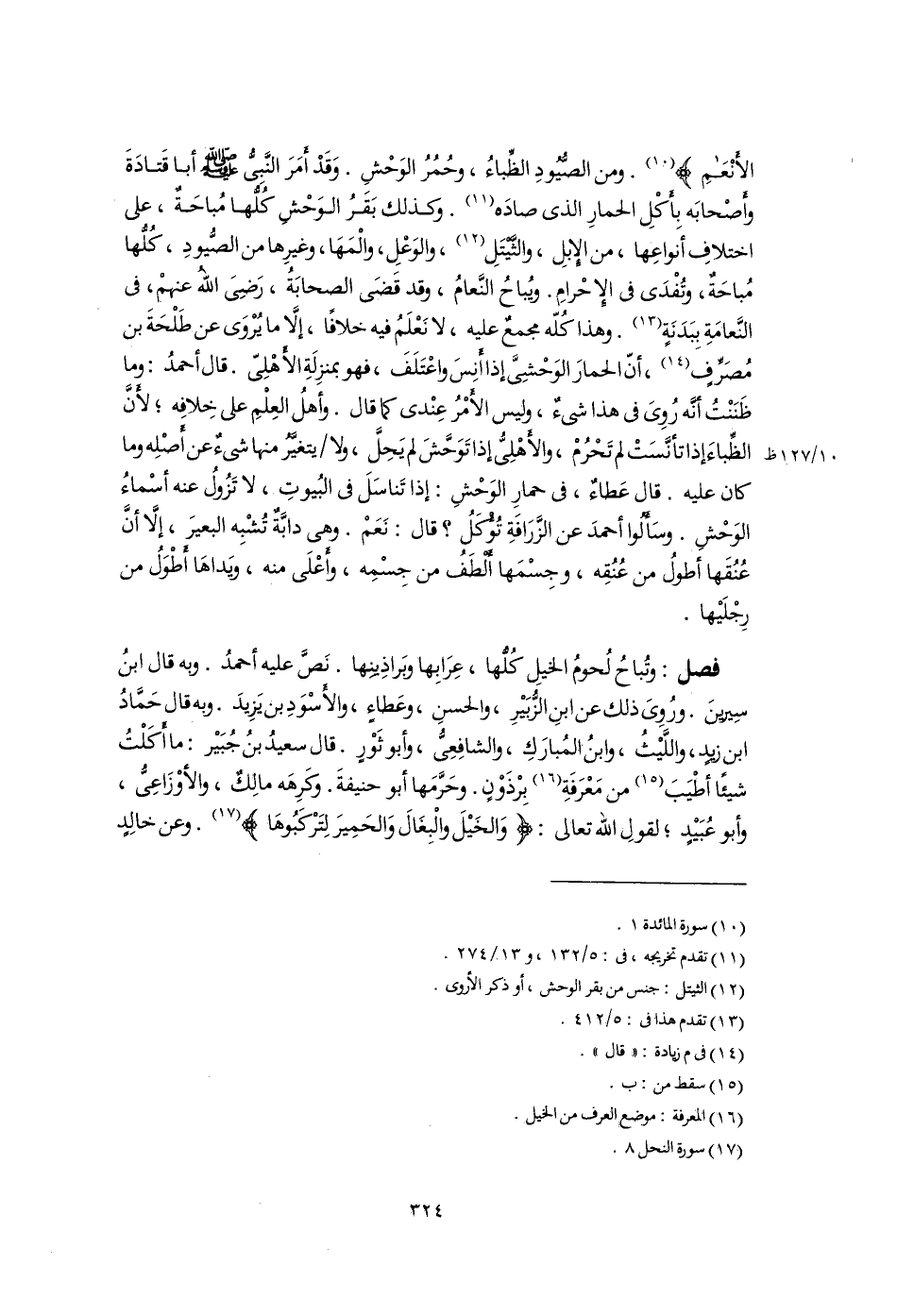 الْأَنْعَامِ} (١٠). ومن الصُّيُودِ الظِّباءُ، وحُمُرُ الوَحْشِ. وَقَدْ أَمَرَ النَّبِىُّ -صلى اللَّه عليه وسلم- أبا قَتادَةَ وأَصْحابَه بِأَكْلِ الحمارِ الذى صادَه (١١). كذلك بَقَرُ الوَحْش كُلُّها مُباحَةٌ، على اختلافِ أنواعِها، من الإِبلِ، والثَّيْتَلِ (١٢)، والوَعْلِ، والْمَهَا، وغيرِها من الصُّيودِ، كُلُّها مُباحَةٌ، وتُفْدَى فى الإِحْرامِ. ويُباحُ النَّعامُ، وقد قَضَى الصحابَةُ، رَضِىَ اللَّهُ عنهمْ، فى النَّعامَةِ ببَدَنَةٍ (١٣). وهذا كُلّه مجمعٌ عليه، لا نَعْلَمُ فيه خلافًا، إلَّا ما يُرْوَى عن طَلْحَةَ بن مُصَرِّفٍ (١٤)، أنّ الحمارَ الوَحْشِىَّ اذا أَنسَ واعْتَلَفَ، فهو بمنزلَة الأَهْلِىّ. قال أحمدُ: وما ظَنَنْتُ أنَّه رُوِىَ فى هذا شىءٌ، وليس الأمْرُ عِنْدى كما قال. وأهلُ العِلْمِ على خِلافِه؛ لأنّ الظِّباءَ إذا تأنَّسَتْ لم تَحْرُمْ، والأهْلِىّ إذا تَوَحَّشَ لم يَحِلَّ، ولا يتغيَّرُ منها شىءٌ عن أصْلِه وما كان عليه. قال عَطاءٌ، فى حمارِ الوَحْشِ: إذا تَناسَلَ فى البُيوتِ، لا تَزُولُ عنه أسْماءُ الوَحْشِ. وسَأَلُوا أحمدَ عن الزَّرَافَةِ تُؤْكَلُ؟ قال: نَعَمْ. وهى دابَّةٌ تُشْبِه البعيرَ، إلَّا أَنَّ عُنُقَها أطولُ من عُنُقِه، وجِسْمَها أَلْطَفُ من جِسْمِه، وأعْلَى منه، ويَداهَا أَطْوَلُ من رِجْلَيْها.