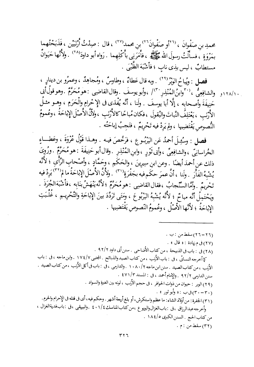 محمدِ بن صَفْوانَ، [أو صَفْوانَ] (٢٦) بنِ محمد (٢٧)، قال: صِدْتُ أَرْنَبَيْن، فَذَبَحْتُهما بمَرْوَةٍ، فسأَلْتُ رسول اللَّه -صلى اللَّه عليه وسلم-، فأَمَرَنِى بأَكْلِهِما. رَواه أبو داودَ (٢٨). ولأَنَّها حَيَوانٌ مستطابٌ، ليس بذِى نابٍ؛ فأشْبَهَ الظَّبْىَ.