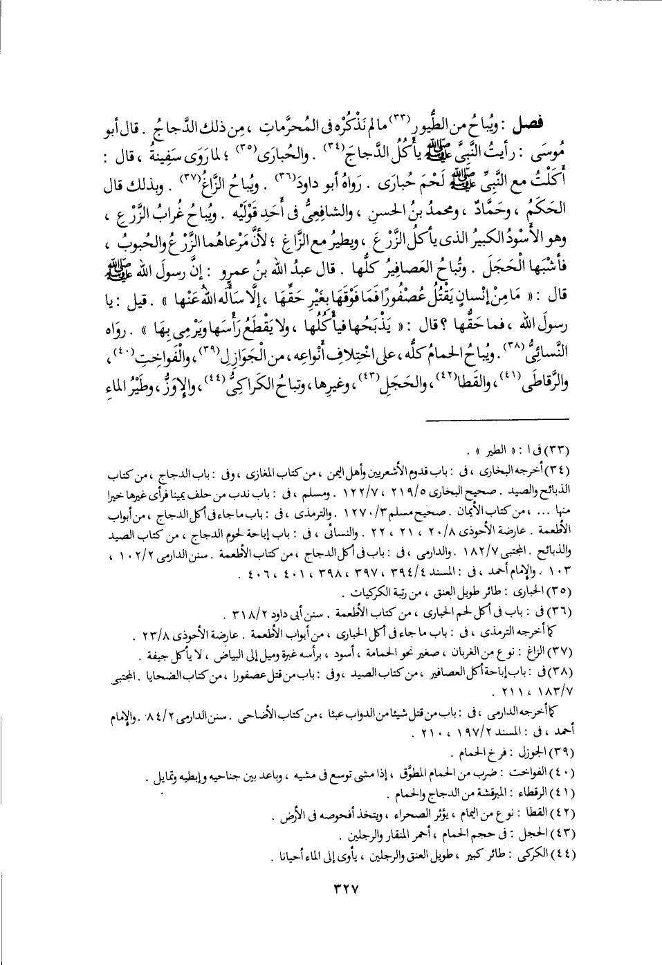 فصل: ويُباحُ من الطُّيور (٣٣) ما لم نَذْكُرْه فى المُحرَّماتِ، مِن ذلك الدَّجاجُ. قال أبو مُوسَى: رأيتُ النَّبِىَّ -صلى اللَّه عليه وسلم- يأْكُلُ الدَّجاجَ (٣٤). والحُبارَى (٣٥)؛ لما رَوَى سَفِينةُ، قال: أَكَلْتُ مع النَّبِىِّ -صلى اللَّه عليه وسلم- لَحْمَ حُبارَى. رَواهُ أبو داودَ (٣٦). ويُباحُ الزَّاغُ (٣٧). وبذلك قال الحَكَم، وحَمَّادٌ، ومحمدُ بنُ الحسنِ، والشافِعِىُّ فى أَحَدِ قَوْلَيْه. ويُباحُ غُرابُ الزَّرْعِ، وهو الأَسْودُ الكبيرُ الذى يأكلُ الزَّرْعَ، ويطيرُ مع الزَّاغِ؛ لأنَّ مَرْعاهُما الزَّرْعُ والحُبوبُ، فأشْبَها الْحَجَلَ. وتُباحُ العَصافِيرُ كلُّها. قال عبدُ اللَّه بنُ عمرو: إنَّ رسولَ اللَّه -صلى اللَّه عليه وسلم- قال: "مَا مِنْ إنْسانٍ يَقْتُلُ عُصْفُورًا فَمَا فَوْقَهَا بِغَيْرِ حَقِّهَا، إلَّا سَأَلَه اللَّهُ عَنْها". قيل: يا رسولَ اللَّه، فما حَقُّها؟ قال: "يَذْبَحُها فيأكُلُها، ولا يَقْطعُ رَأْسَها ويَرْمِى بِهَا". روَاه النَّسائِىُّ (٣٨). ويُباحُ الحمامُ كلُّه، على اخْتِلافِ أَنْواعِه، من الْجَوَازِلِ (٣٩)، والْفَواخِتِ (٤٠)، والرَّقاطَى (٤١)، والقَطا (٤٢)، والحَجَلِ (٤٣)، وغيرِها، وتباحُ الكَراكِىُّ (٤٤)، والإِوَزُّ، وطَيْرُ الماءِ