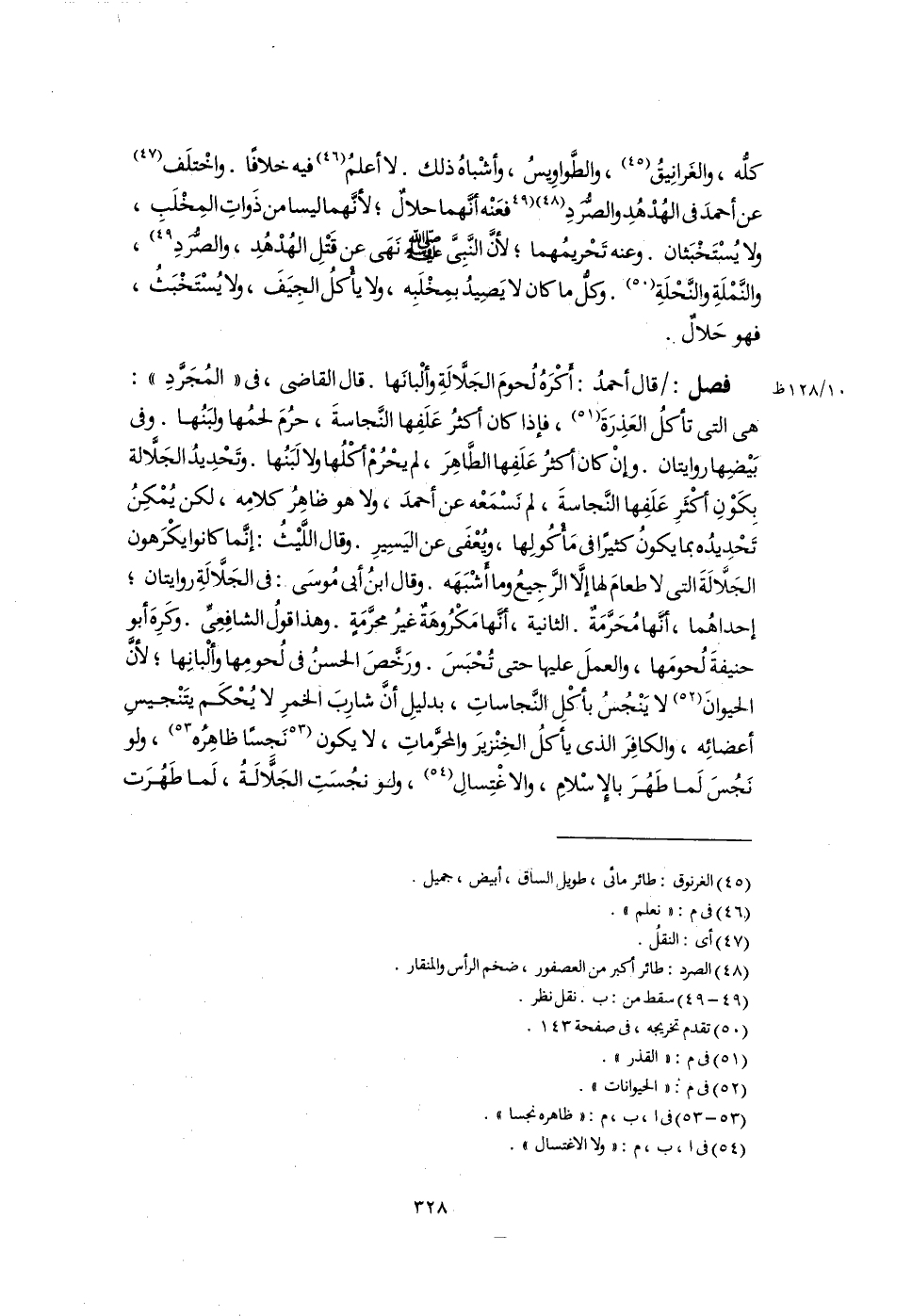 كلُّه، والغَرانِيقُ (٤٥)، والطَّواوِيسُ، وأشْباهُ ذلك. لا أعلمُ (٤٦) فيه خلافًا. واخْتلَف (٤٧) عن أحمدَ فى الهُدْهُدِ والصُّرَدِ (٤٨) [فعَنْه أنَّهما حلالٌ؛ لأنَّهما ليسا من ذَواتِ المِخْلَبِ، ولا يُسْتَخْبَثان. وعنه تَحْريمُهما؛ لأنَّ النَّبِىَّ -صلى اللَّه عليه وسلم- نَهَى عن قَتْلِ الهُدْهُدِ، والصُّردِ] (٤٩)، والنَّمْلَةِ والنَّحْلَةِ (٥٠). كلُّ ما كان لا يَصِيدُ بمِخْلَبِه، ولا يأْكلُ الجِيَفَ، ولا يُسْتَخْبَثُ، فهو حَلالٌ.