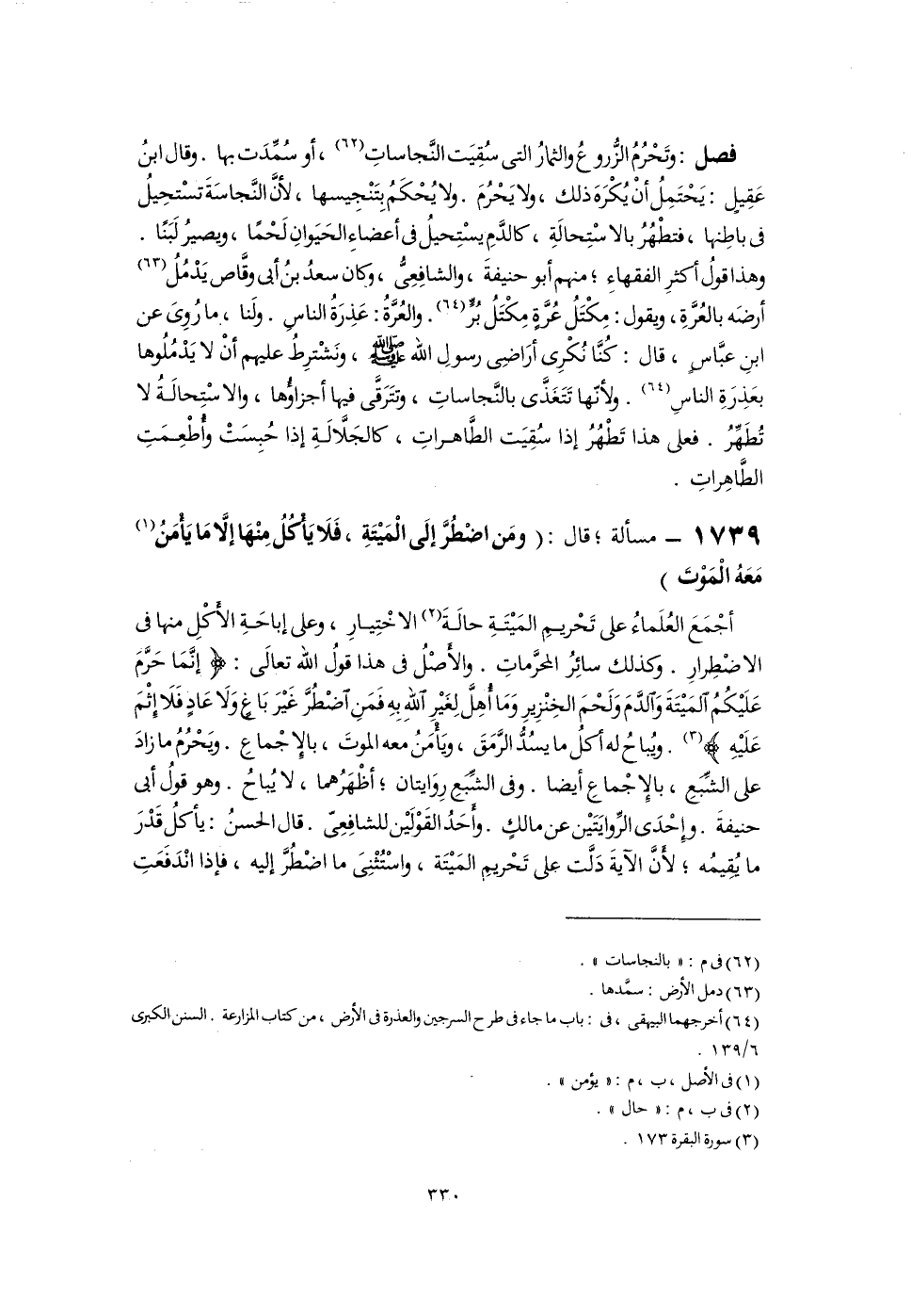 فصل: وتَحْرُمُ الزُّروعُ والثمارُ التى سُقِيَت النَّجاساتِ (٦٢)، أو سُمِّدَت بها. وقال ابنُ عَقِيلٍ: يَحْتَمِلُ أَنْ يُكْرَهَ ذلك، ولا يَحْرُمَ. ولا يُحْكَمُ بِتَنْجِيسها؛ لأنَّ النَّجاسَةَ تسْتحِيلُ فى باطِنها، فتطْهُرُ بالاسْتِحالَةِ، كالدَّمِ يسْتِحيلُ فى أعضاءِ الحَيَوانِ لَحْمًا، ويصيرُ لَبَنًا. وهذا قولُ أكثرِ الفقهاءِ؛ منهم أبو حنيفةَ، والشافِعِىُّ؛ لأنَّ سعدُ بنُ أبى وقَّاص يَدْمُلُ (٦٣) أرضَه بالعُرَّةِ، ويقول: مِكْتَلُ عُرَّةٍ مِكْتَلُ بُرٍّ (٦٤). والعُرَّةُ: عَذِرَةُ الناس. ولَنا، ما رُوِىَ عن ابنِ عبَّاسٍ، قال: كُنَّا نُكْرِى أرَاضِى رسولِ اللَّه -صلى اللَّه عليه وسلم-، ونَشْترِطُ عليهم أَنْ لا يَدْمُلُوها بعَذِرَةِ الناسِ (٦٤). ولأنّها تَتَغَذَّى بالنَّجاساتِ، وتتَرَقَّى فيها أجزاؤُها، والاسْتِحالَةُ لا تُطَهِّرُ. فعلى هذا تَطْهُرُ إذا سُقِيَت الطَّاهراتِ، كالجَلَّالَةِ إذا حُبِسَتْ وأُطْعِمَتِ الطَّاهِراتِ.