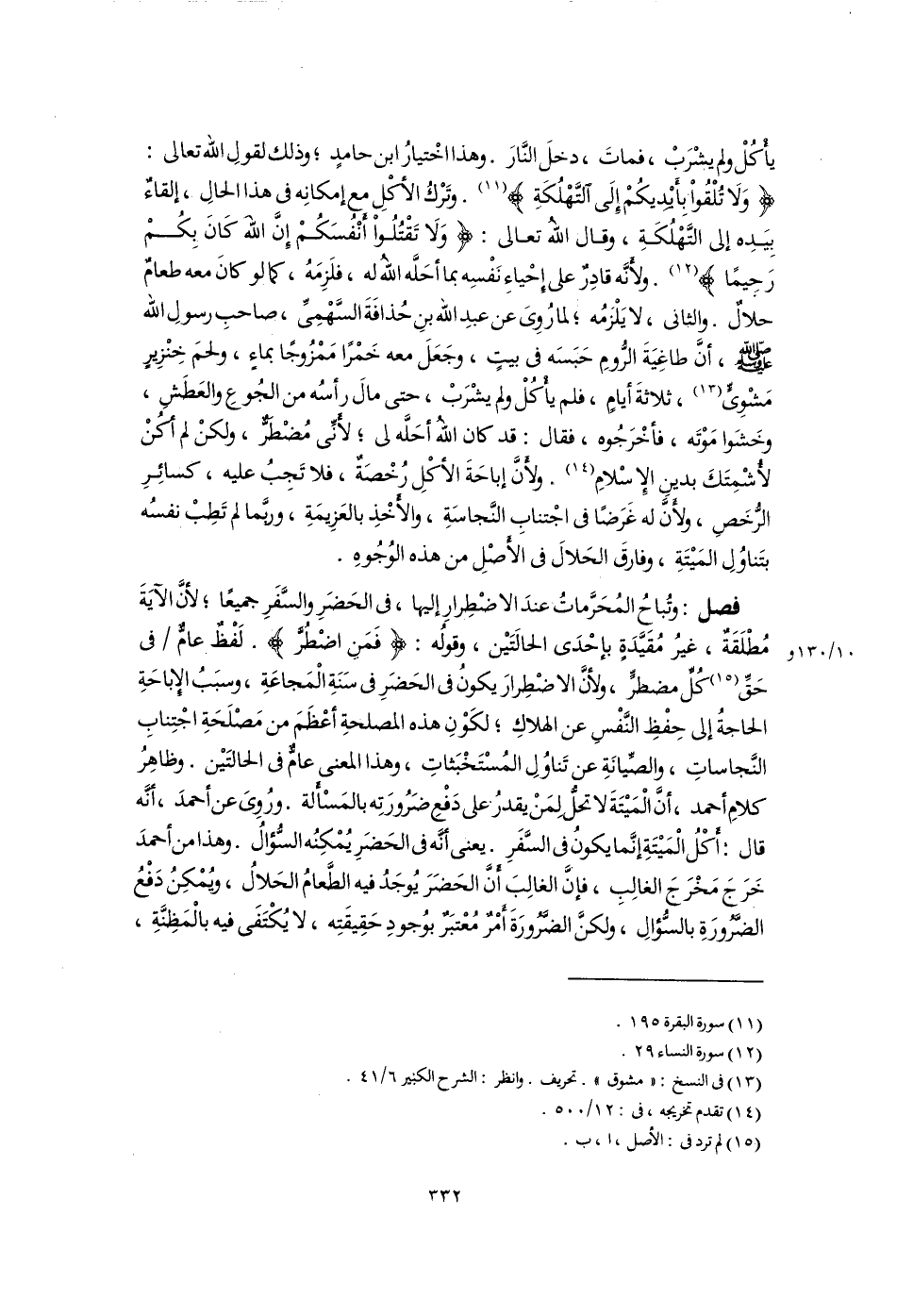 فصل: وتُباحُ المُحَرَّماتُ عندَ الاضْطِرارِ إليها، فى الحَضَرِ والسَّفَرِ جميعًا؛ لأنَّ الآيَةَ مُطْلَقَةٌ، غيرُ مُقَيَّدَةٍ بإحْدَى الحالَتَيْن، وقولُه: {فَمَنِ اضْطُرّ}. لَفْظٌ عامٌّ فى حَقِّ (١٥) كُلِّ مضطرٍّ، ولأنَّ الاضْطِرارَ يكونُ فى الحَضَرِ فى سَنَةِ الْمَجاعَةِ، وسبَبُ الإِباحَةِ الحاجةُ إلى حِفْظِ النَّفْسِ عن الهلاكِ، لكَوْنِ هذه المصلحةِ أعْظَمَ من مَصْلَحَةِ اجْتِنابِ النَّجاساتِ، والصِّيانَةِ عن تَناوُلِ المُسْتَخْبَثاتِ، وهذا المعنى عامٌّ فى الحالتَيْن. وظاهِرُ كلامِ أحمد، أَنَّ الْمَيْتَةَ لا تحلُّ لمَنْ يقدرُ على دَفْعِ ضَرُورَتِه بالمَسْأَلة. ورُوِىَ عن أحمدَ، أنَّه قال: أكلُ الْمَيْتَةِ إنَّما يكونُ فى السَّفَرِ. يعنى أنَّه فى الحَضَرِ يُمْكِنُه السُّؤالُ. وهذا من أحمدَ خَرَجَ مَخْرَجَ الغالِبِ، فإنَّ الغالِبَ أَنَّ الحَضَرَ يُوجَدُ فيه الطَّعامُ الحَلالُ، ويُمْكِنُ دَفْعُ الضَّرورَةِ بالسُّؤالِ، ولكنَّ الضَّرورَةَ أَمْرٌ مُعْتبَر بوُجودِ حَقِيقَتِه، لا يُكْتَفَى فيه بالْمَظنَّةِ،