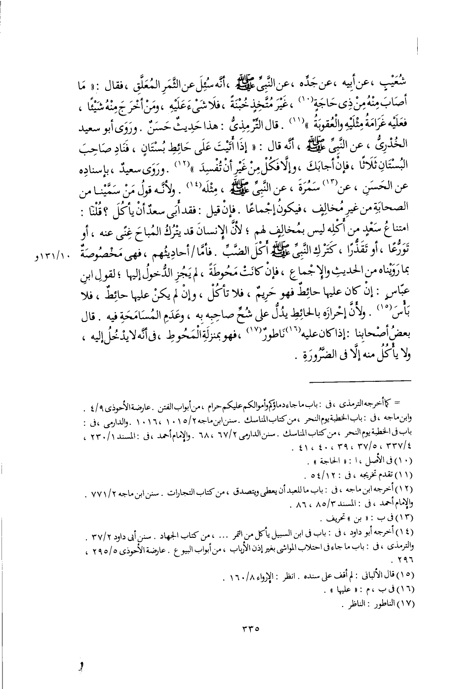 (١٤) أخرجه أبو داود، فى: باب فى ابن السبيل يأكل من التمر. . .، من كتاب الجهاد. سنن أبى داود ٢/ ٣٧. والترمذى، فى: باب ما جاء فى احتلاب المواشى بغير إذن الأرباب، من أبواب البيوع. عارضة الأحوذى ٥/ ٢٩٥، ٢٩٦.