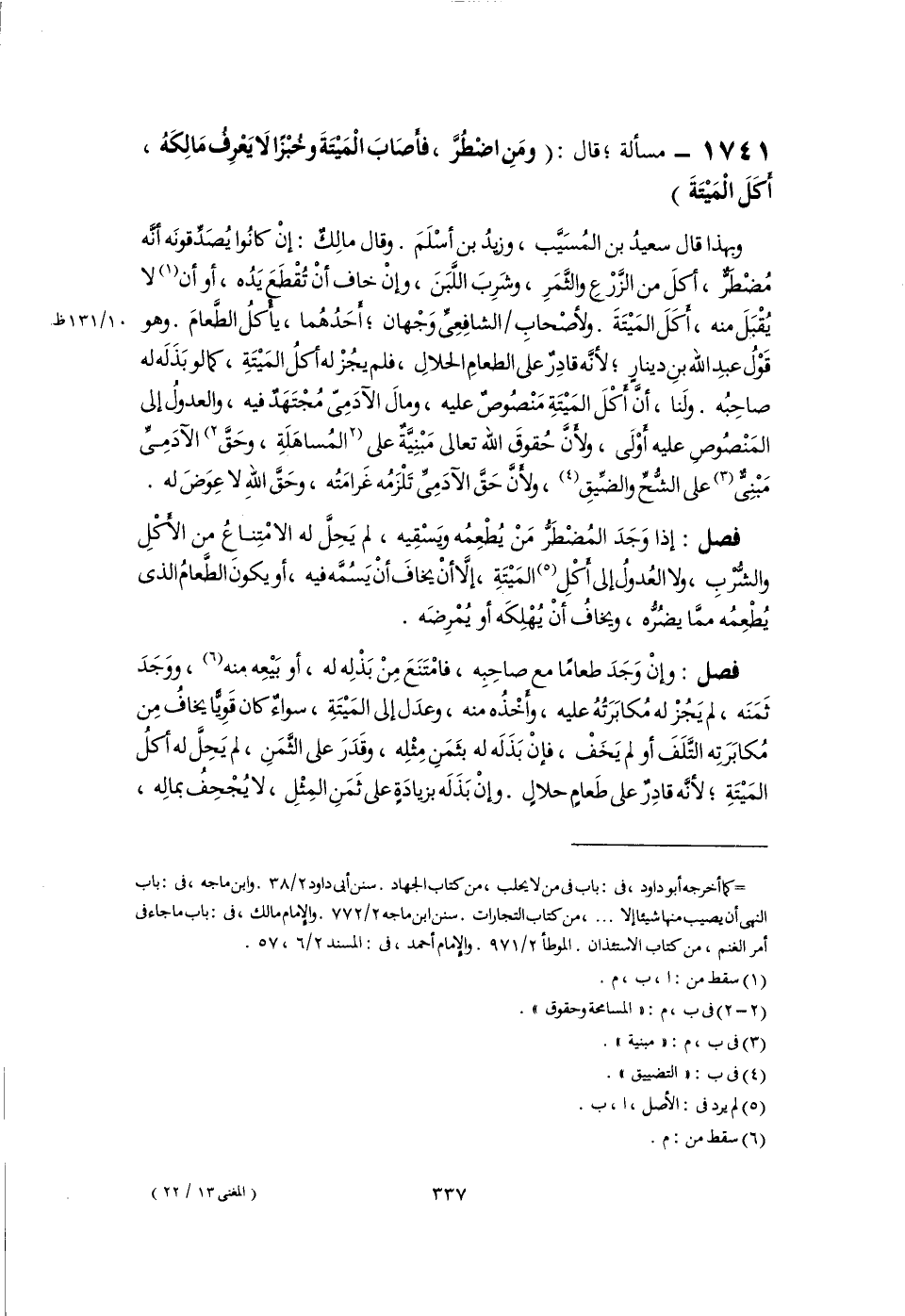 فصل: وإِنْ وَجَدَ طعامًا مع صاحِبِه، فامْتَنَعَ مِنْ بَذْلِه له، أو بَيْعِه منه (٦)، ووَجَدَ ثَمَنَه، لم يَجُزْ له مُكابَرَتُهُ عليه، وأخْذُه منه، وعدَل إلى المَيْتَةِ، سواءٌ كان قَوِيًّا يخافُ مِن مُكابَرَتِه التَّلَفَ أو لم يَخَفْ، فإنْ بَذَلَه له بثَمَنِ مِثْلِه، وقَدَرَ على الثَّمَنِ، لم يَحِلَّ له أكلُ المَيْتَةِ؛ لأنَّه قادِرٌ على طَعامٍ حلالٍ. وإِنْ بَذَلَه بزيادَةٍ على ثَمَنِ المِثْلِ، لا يُجْحِفُ بمالِه،