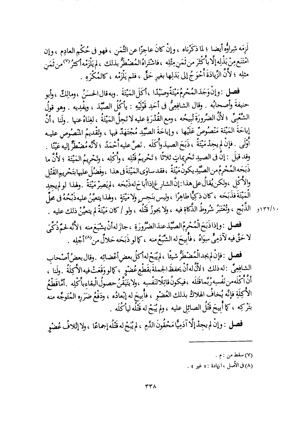فصل: وإذا ذَبَحَ الْمُحْرِمُ الصيدَ عندَ الضَّرُورَةِ، جازَ له أَنْ يشْبَعَ منه؛ لأنَّه لحمٌ ذُكِّىَ لا حَقَّ فيه لآدَمِىٍّ سِوَاهُ، فأبِيحَ له الشِّبعُ منه، كما لو ذَبَحَه حَلالٌ من (٨) أجْلِه.