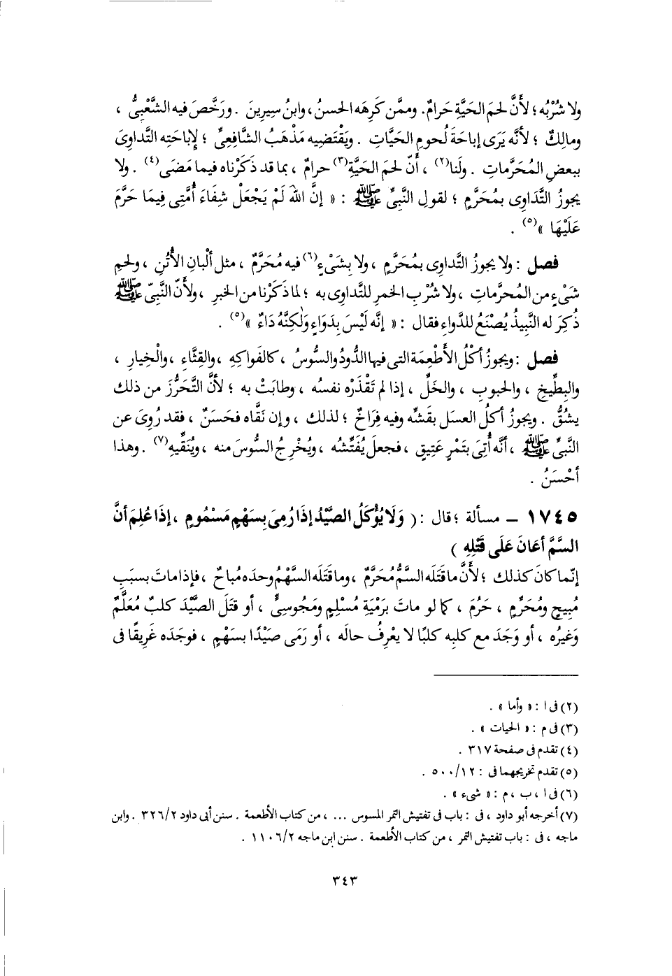 ولا شُرْبُه؛ لأنَّ لحمَ الحَيَّةِ حَرامٌ. وممَّن كَرِهَه الحسنُ، وابنُ سِيرِينَ. ورَخَّصَ فيه الشَّعْبِىُّ، ومالِكٌ؛ لأنَّه يَرَى إباحَةَ لُحوم الحَيَّاتِ. ويَقْتَضِيه مَذْهَبُ الشَّافِعِى؛ لإِباحَتِه التَّداوِيَ ببعض المُحَرَّماتِ. ولَنا (٢)، أَنّ لحمَ الحَيَّةِ (٣) حرامٌ، بما قد ذَكَرْناه فيما مَضَى (٤). ولا يجوزُ التَّدَاوِى بمُحَرَّمٍ؛ لقولِ النَّبِىِّ -صلى اللَّه عليه وسلم-: "إِنَّ اللَّه لَمْ يَجْعَلْ شِفَاءَ أُمَّتِى فِيمَا حَرَّمَ عَلَيْهَا" (٥).