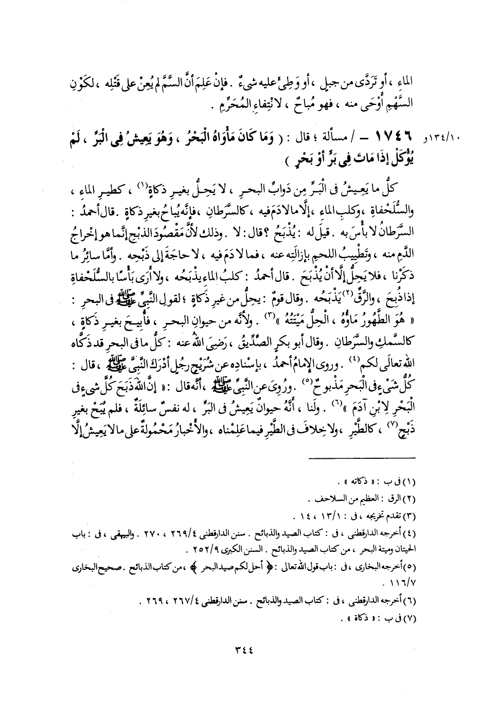 كل ما يَعِيشُ فى الْبَر مِن دَوابِّ البحرِ، لا يَحِلُّ بغيرِ ذكاةٍ (١)، كطيرِ الماءِ، والسُّلَحْفاةِ، وكلبِ الماءِ، إلَّا ما لا دَمَ فيه، كالسَّرَطَانِ، فإنَّه يُباحُ بغيرِ ذكاةٍ. قال أحمدُ: السَّرطَانُ لا بأْسَ به. قيلَ له: يُذْبَحُ؟ قال: لا. وذلك لأنَّ مَقْصُودَ الذبْحِ إنَّما هو إخْراجُ الدَّمِ منه، وتَطْيِيبُ اللحمِ بإزالَتِه عنه، فما لا دَمَ فيه، لا حاجَةَ إلى ذَبْحِه. وأمَّا سائِرُ ما ذكَرْنا، فلا يَحِلُّ إلَّا أَنْ يُذْبَحَ. قال أحمدُ: كلبُ الماءِ يذْبَحُه، ولا أرَى بَأسًا بالسُّلَحْفاةِ إذا ذُبِحَ، والرَّقِّ (٢) يَذْبَحُه. وقال قومٌ: يحِلُّ من غيرِ ذَكاةٍ؛ لقولِ النَّبِىِّ -صلى اللَّه عليه وسلم- فى البحرِ: "هُوَ الطَّهُورُ مَاؤُهُ، الْحِلُّ مَيْتَتُهُ" (٣). ولأنَّه من حيوانِ البحرِ، فأُبِيحَ بغيرِ ذَكاةٍ، كالسَّمكِ والسَّرَطَانِ. وقال أبو بكرٍ الصِّدِّيقُ، رَضِىَ اللَّهُ عنه: كلُّ ما فى البحرِ قد ذَكَّاه اللَّه تعالَى لكم (٤). وروى الإِمامُ أحمدُ، بإسْنادِه عن شُرَيْحٍ رجُلٍ أدْرَكَ النَّبِىَّ -صلى اللَّه عليه وسلم-، قال: كُلُّ شَىْءٍ فى الْبَحرِ مَذْبوحٌ (٥). ورُوِىَ عن النَّبِىِّ -صلى اللَّه عليه وسلم-، أنَّه قال: "إنَّ اللَّه ذَبَحَ كُلَّ شىءٍ فى الْبَحْرِ لِابْنِ آدَمَ" (٦). ولَنا، أَنَّهُ حيوانٌ يَعِيشُ فى البَرِّ، له نفسٌ سائِلَةٌ، فلم يُبَحْ بغيرِ ذَبْحٍ (٧)، كالطَّيْرِ، ولا خِلافَ فى الطَّيْرِ فيما عَلِمْناه، والأَخْبارُ مَحْمُولةٌ على ما لا يَعِيشُ إلَّا