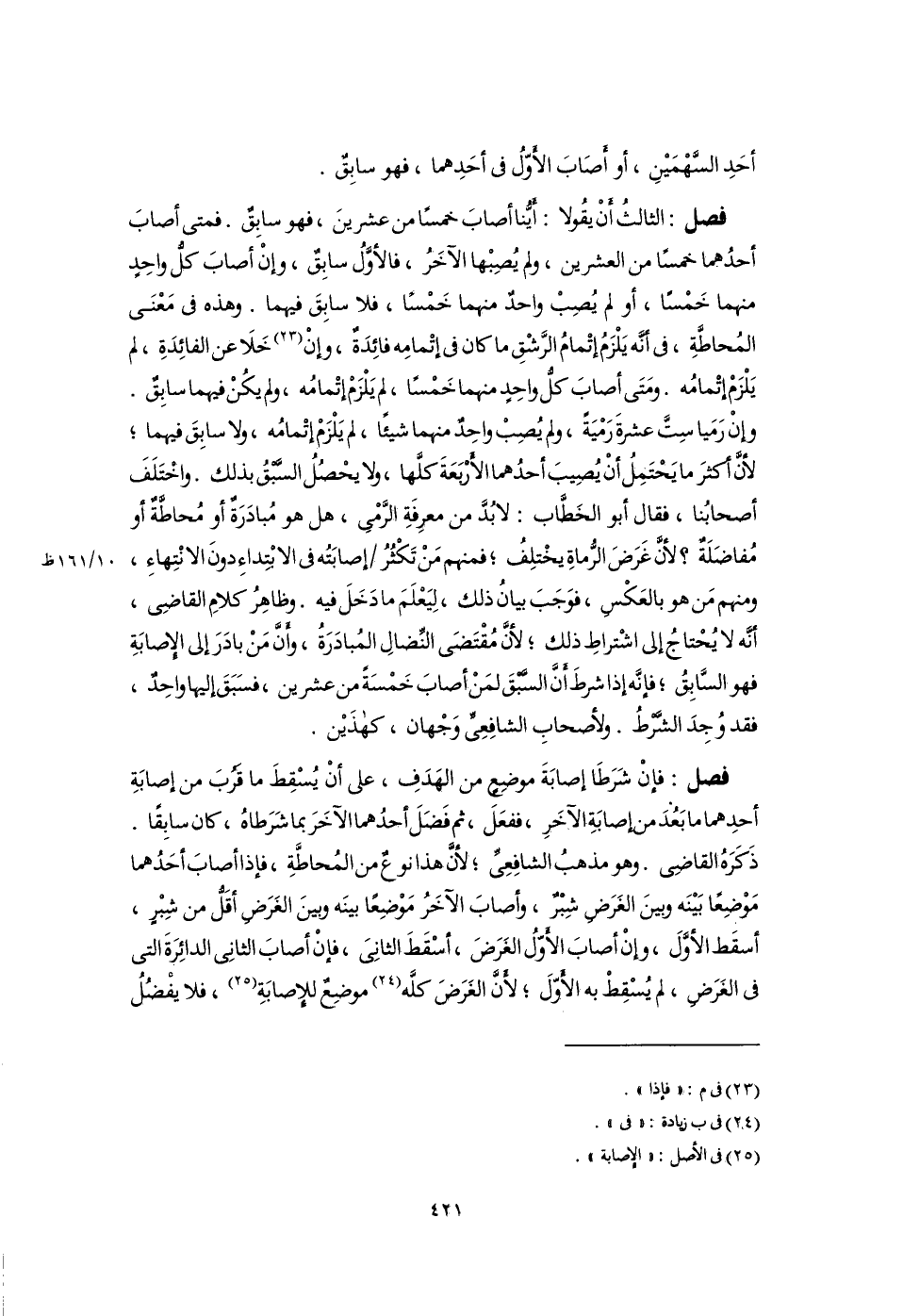 فصل: الثالثُ أَنْ يقُولا: أَيُّنا أصابَ خمسًا من عشرينَ، فهو سابِقٌ. فمتى أصابَ أحدُهما خمسًا من العشرين، ولم يُصِبْها الآخَرُ، فالأوَّلُ سابِقٌ، وإِنْ أصابَ كلُّ واحِدٍ منهما خَمْسَا، أو لم يُصِبْ واحدٌ منهما خَمْسًا، فلا سابِقَ فيهما. وهذه فى مَعْنَى المُحاطَّةِ، فى أنَّه يَلْزَمُ إتْمامُ الرَّشْقِ ما كان فى إتْمامِه فائِدَةٌ، وإِنْ (٢٣) خَلَا عن الفائِدَةِ، لم يَلْزَمْ إتْمامُه. ومَتَى أصابَ كلُّ واحِدٍ منهما خَمْسًا، لم يَلْزَمْ إتْمامُه، ولم يكُنْ فيهما سابِقٌ. وإِنْ رَمَيا سِتَّ عشرةَ رَمْيَةً، ولم يُصِبْ واحِدٌ منهما شيئًا، لم يَلْزَمْ إتْمامُه، ولا سابِقَ فيهما؛ لأنَّ أكثرَ ما يَحْتَمِلُ أَنْ يُصِيبَ أحدُهما الأرْبَعَةَ كلَّها، ولا يحْصُلُ السَّبْقُ بذلك. واخْتَلَفَ أصحابُنا، فقال أبو الخَطَّاب: لابُدَّ من معرِفَةِ الرَّمْى، هل هو مُبادَرَةٌ أو مُحاطَّةٌ أو مُفاضَلَةٌ؟ لأنَّ غَرَضَ الرُّماةِ يخْتلِفُ؛ فمنهم مَنْ تَكْثُرُ إصابَتُه فى الابْتِداءِ دونَ الانْتِهاءِ، ومنهم مَن هو بالعَكْسِ، فوَجَبَ بيانُ ذلك، لِيَعْلَمَ ما دَخَلَ فيه. وظاهِرُ كلامِ القاضِى، أنَّه لا يُحْتاجُ إلى اشْتراطِ ذلك؛ لأنَّ مُقْتَضَى النِّضالِ المُبادَرَةُ، وأن مَنْ بادَرَ إلى الإِصابَةِ فهو السَّابِقُ؛ فإنَّه إذا شرطَ أَنَّ السَّبْقَ لمَنْ أصابَ خَمْسَةً من عشرين، فسَبَقَ إليها واحِدٌ، فقد وُجِدَ الشَّرْطُ. ولأصحابِ الشافِعِىِّ وَجْهان، كهذَيْن.