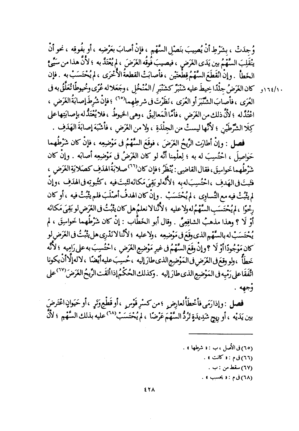 وُجِدَتْ، بِشَرْطِ أَنْ يُصِيبَ بنَصْلِ السَّهْمِ، فإنْ أصابَ بعَرْضِه، أو بفُوقِه، نحو أَنْ ينْقَلِبَ السَّهْمُ بين يَدَى الغَرَضِ، فيصيبَ فُوقُه الغَرَضَ، لم يُعْتَدَّ به؛ لأنَّ هذا من سَيِّئ الخطأ. وإِنْ انْقَطعَ السَّهمُ قِطْعتَيْن، فأصابَتْ القطعةُ الأُخْرَى، لم يُحْتَسَبْ به. فإن كان الغَرَضُ جِلْدًا خِيطَ عليه شَنْبَرٌ كَشَنْبَرِ المُنْخُلِ، وجَعَلا له عُرًى وخُيوطًا تُعَلَّقُ به فى العُرَى، فأصابَ الشَّنْبَرَ أو العُرَى، نَظَرْتَ فى شرطِهِما (٦٥)؛ فإنْ شُرِطَ إصابَةُ الغَرَض، اعْتُدَّ له؛ لأنَّ ذلك من الغَرَضِ، فأمَّا الْمَعالِيقُ، وهى الخيوطُ، فلا يُعْتَدُّ له بإصابَتِها على كِلَا الشَّرْطَيْنِ؛ لأنَّها ليستْ من الجِلْدَةِ، ولا من الغرَض، فأشْبَهَ إصابَةَ الهَدَفِ.