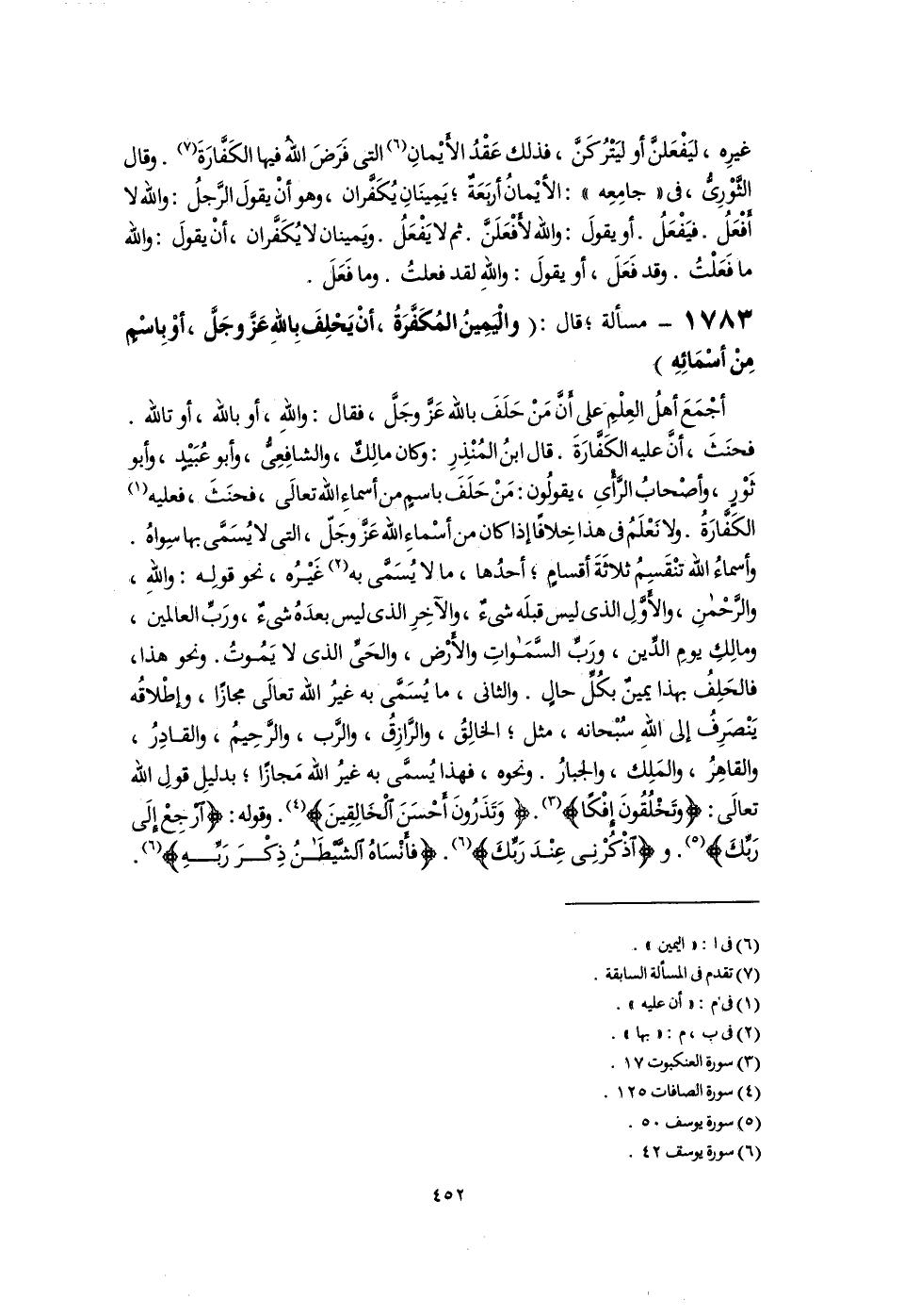أجْمَعَ أهلُ العِلْمِ على أن مَنْ حَلَفَ باللَّه عَزَّ وجَلَّ، فقال: واللَّهِ، أو باللَّه، أو تاللَّه. فحنَثَ، أَنَّ عليه الكَفَّارَةَ. قال ابنُ المُنْذِرِ: وكان مالِكٌ، والشافِعِىُّ، وأبو عُبَيْدٍ، وأبو ثَوْرٍ، وأصْحابُ الرَّأْىِ، يقولُون: مَنْ حَلَفَ باسمٍ من أسماءِ اللَّه تعالَى، فحنَثَ، فعليه (١) الكَفَّارَةُ. ولا نَعْلَمُ فى هذا خِلافًا إذا كان من أسْماءِ اللَّه عَزَّ وَجَلَّ، التى لا يُسَمَّى بها سِواهُ. وأسماءُ اللَّه تنْقَسِمُ ثلاثَةَ أقسامٍ؛ أحدُها، ما لا يُسَمَّى به (٢) غَيْرُه، نحو قولِه: واللَّهِ، والرَّحْمنِ، والأَوَّلِ الذى ليس قبلَه شىءٌ، والآخِرِ الذى ليس بعدَهُ شىءٌ، ورَبِّ العالمين، ومالِكِ يومِ الدِّين، ورَبِّ السَّمَواتِ والأَرْض، والحَىِّ الذى لا يَمُوتُ. ونحو هذا، فالحَلِفُ بهذا يمينٌ بكُلِّ حالٍ. والثانى، ما يُسَمَّى به غيرُ اللَّه تعالَى مجازًا، وإطْلاقُه يَنْصَرِفُ إلى اللَّهِ سُبْحانه، مثل؛ الخالِقُ، والرَّازِقُ، والرَّب، والرَّحِيمُ، والقادِرُ، والقاهِرُ، والمَلِك، والجبارُ. ونحوه، فهذا يُسمَّى به غيرُ اللَّه مَجازًا؛ بدليلِ قولِ اللَّه تعالَى: {وَتَخْلُقُونَ إِفْكًا} (٣). {وَتَذَرُونَ أَحْسَنَ الْخَالِقِينَ} (٤). وقوله: {ارْجِعْ إلَى رَبِّكَ} (٥). و {اذْكُرْنِى عِنْدَ رَبِّكَ} (٦). {فَأَنْسَاهُ الشَّيْطَانُ ذِكْرَ رَبِّهِ} (٦).