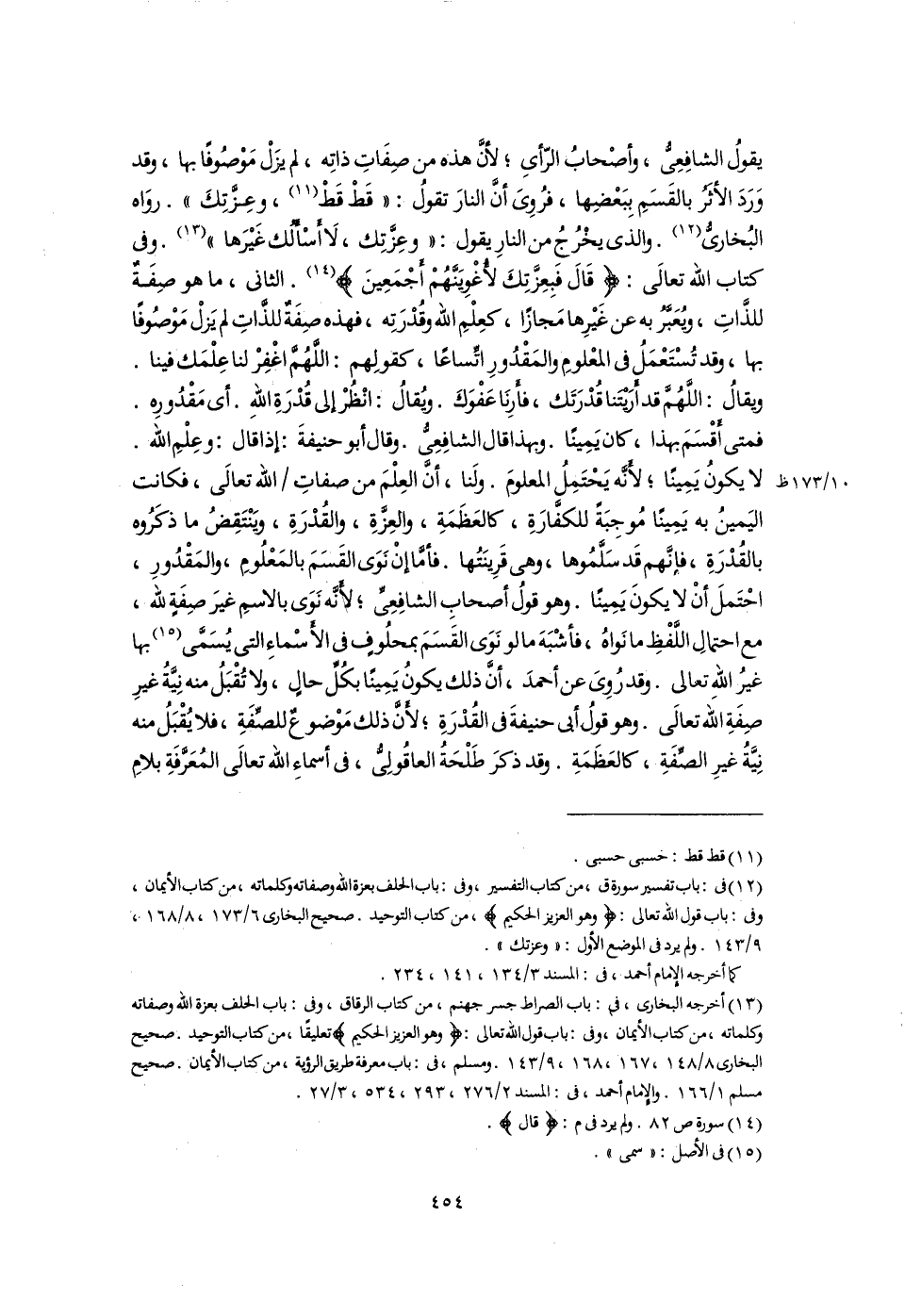(١٣) أخرجه البخارى، فى: باب الصراط جسر جهنم، من كتاب الرقاق، وفى: باب الحلف بعزة اللَّه وصفاته وكلماته، من كتاب الأيمان، وفى: باب قول اللَّه تعالى: {وَهُوَ الْعَزِيزُ الْحَكِيمُ} تعليقًا، من كتاب التوحيد. صحيح البخارى ٨/ ١٤٨، ١٦٧، ١٦٨، ٩/ ١٤٣. ومسلم، فى: باب معرفة طريق الرؤية، من كتاب الأيمان. صحيح مسلم ١/ ١٦٦. والإمام أحمد، فى: المسند ٢/ ٢٧٦، ٢٩٣، ٥٣٤، ٣/ ٢٧.