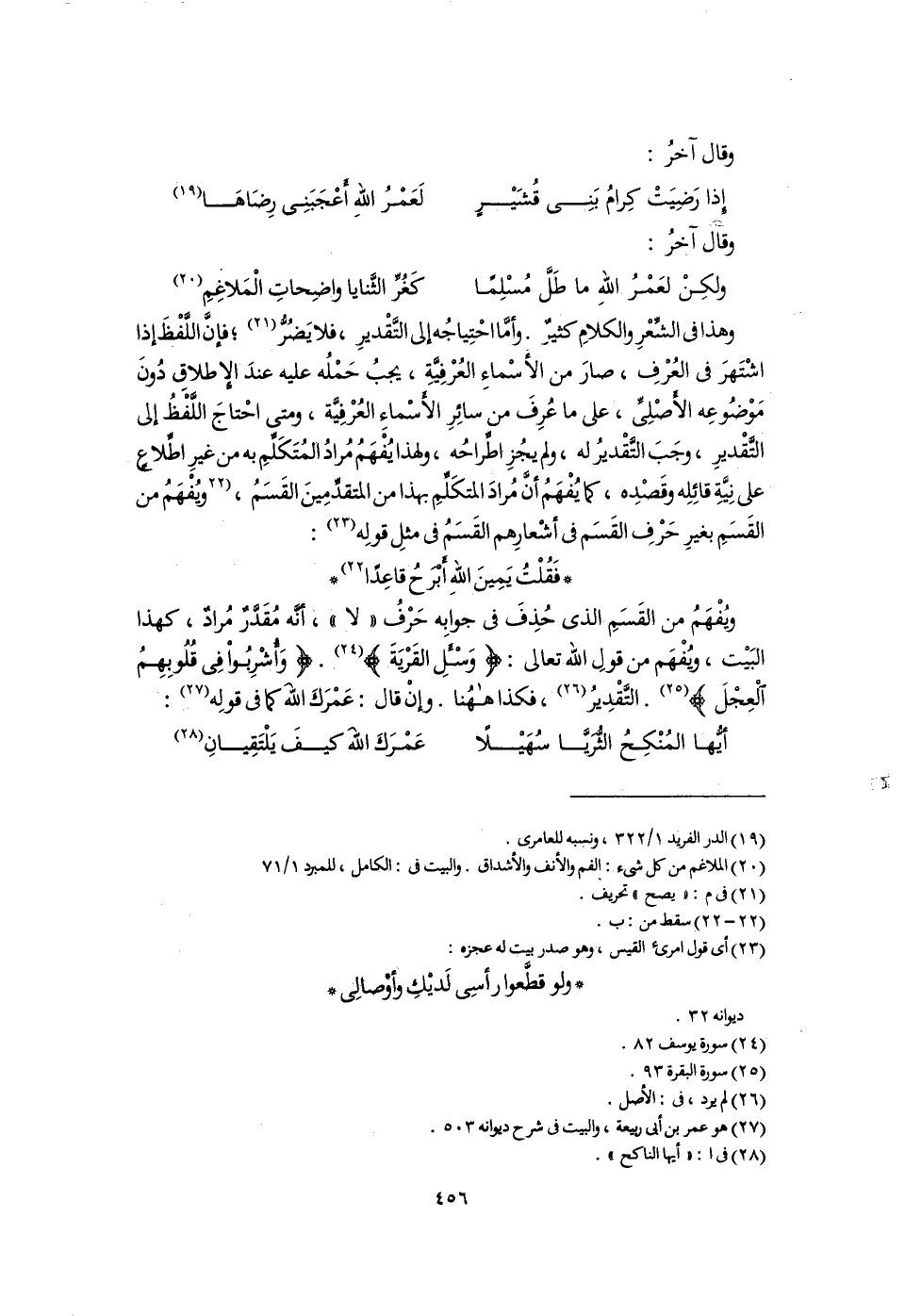 ويُفْهَمُ من القَسَمِ الذى حُذِفَ فى جوابه حَرْفُ "لا"، أنَّه مُقَدَّرٌ مُرادٌ، كهذا البَيْت، ويُفْهَم من قولِ اللَّه تعالى: {وَاسْأَلِ الْقَرْيَةَ} (٢٤). {وَأُشْرِبُوا فِى قُلُوبِهِمُ الْعِجْلَ} (٢٥). التَّقْدِيرُ (٢٦)، فكذا ههُنا. وإِنْ قال: عَمْرَكَ اللَّه كما فى قولِه (٢٧):