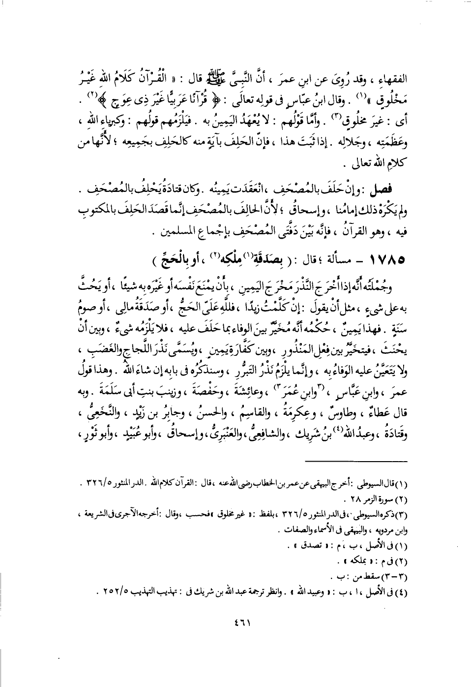 الفقهاءِ، وقد رُوِىَ عن ابنِ عمرَ، أَنَّ النَّبِىَّ -صلى اللَّه عليه وسلم- قال: "الْقُرْآنُ كَلَامُ اللَّهِ غَيْرُ مَخْلُوقٍ" (١). وقال ابنُ عبّاسٍ فى قولِه تعالَى: {قُرْآنًا عَرَبِيًّا غَيْرَ ذِى عِوَجٍ} (٢). أى: غيرَ مخلُوقٍ (٣). وأما قَوْلُهم: لا يُعْهَدُ اليَمِينُ به. فيَلْزَمُهم قولُهم: وكبرياءِ اللَّهِ، وعَظَمَتِه، وجَلالِه. إذا ثَبَتَ هذا، فإنّ الحَلِفَ بآيَةٍ منه كالحَلِفِ بجَمِيعِه؛ لأنَّها من كلامِ اللَّه تعالى.