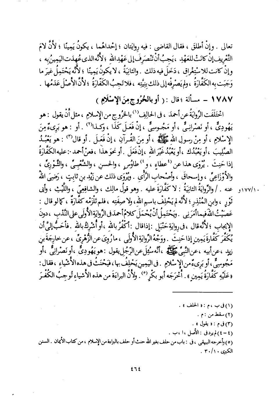 (٥) وأخرجه البيهقى، فى: باب من حلف بغير اللَّه حنث أو حلف بالبراءة من الإسلام، من كتاب الأيمان. السنن الكبرى ١٠/ ٣٠.