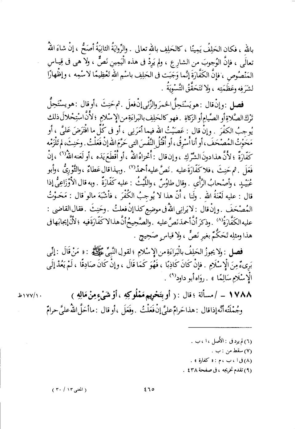 فصل: ولا يجوزُ الحَلِفُ بالْبَراءَةٍ من الإِسْلامِ، لقولِ النَّبِىِّ -صلى اللَّه عليه وسلم-: "مَنْ قَالَ: إنِّى بَرِىءٌ مِنَ الإِسْلَامِ. فإنْ كَانَ كَاذِبًا، فَهُوَ كَمَا قَالَ، وإِنْ كَانَ صَادِقًا، لَمْ يَعُدْ إلَى الإِسْلَامِ سَالِمًا". روَاه أبو داود (٩).