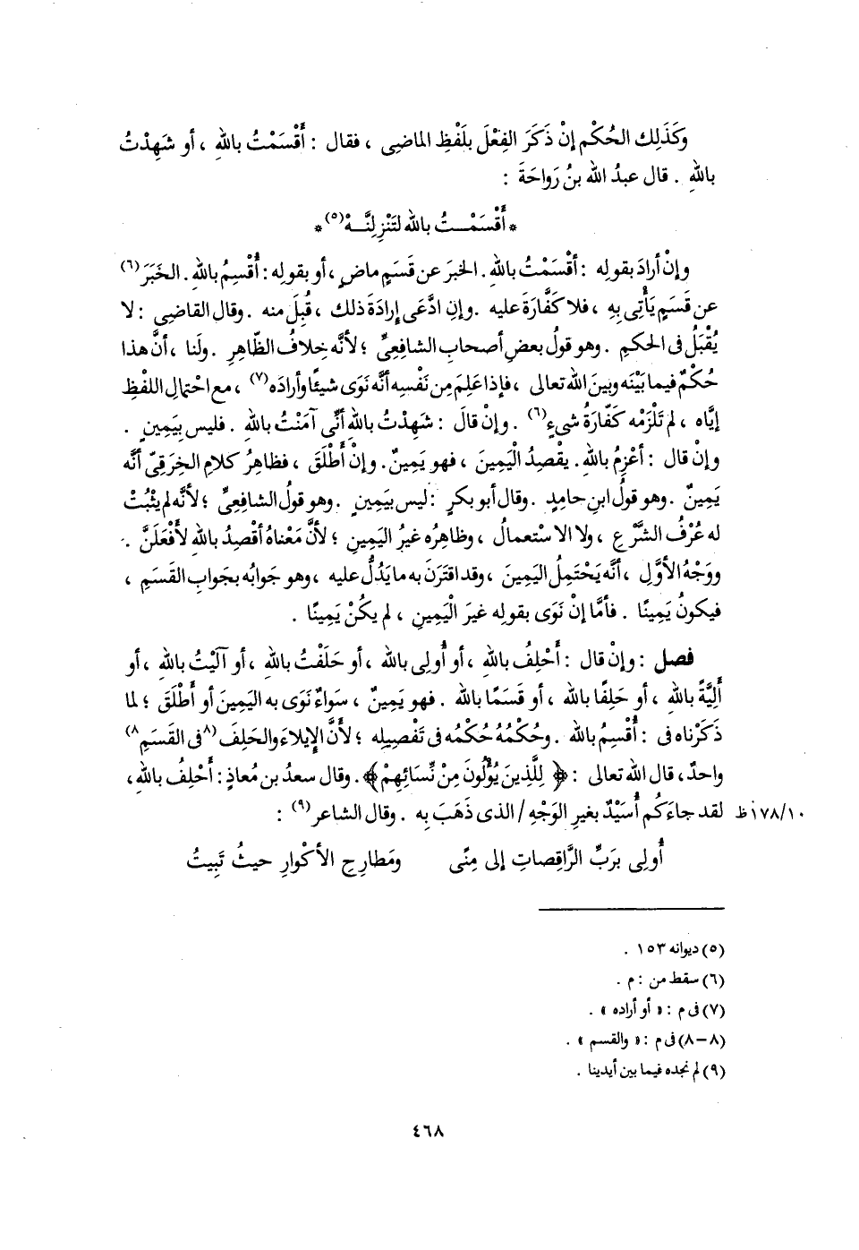 فصل: وإِنْ قال: أَحْلِفُ باللَّهِ، أو أُولِى باللَّه، أو حَلَفْتُ باللَّهِ، أو آلَيْتُ باللَّهِ، أو ألِيَّةً باللَّهِ، أو حَلِفًا باللَّه، أو قَسَمًا باللَّه. فهو يَمِينٌ، سَواءٌ نَوَى به اليَمِينَ أو أَطْلَقَ؛ لما ذَكَرْناه فى: أُقْسِمُ باللَّه. وحُكْمُهُ حُكْمُه فى تَفْصِيلِه؛ لأَنَّ الإِيلاءَ والحَلِفَ [فى القَسَمِ] (٨) واحدٌ، قال اللَّه تعالى: {لِلَّذِينَ يُؤْلُونَ مِنْ نِسَائِهِمْ}. وقال سعدُ بن مُعاذٍ: أَحْلِفُ باللَّهِ، لقد جاءَكُم أُسَيْدٌ بغيرِ الوَجْهِ الذى ذَهَبَ بِه. وقال الشاعر (٩):