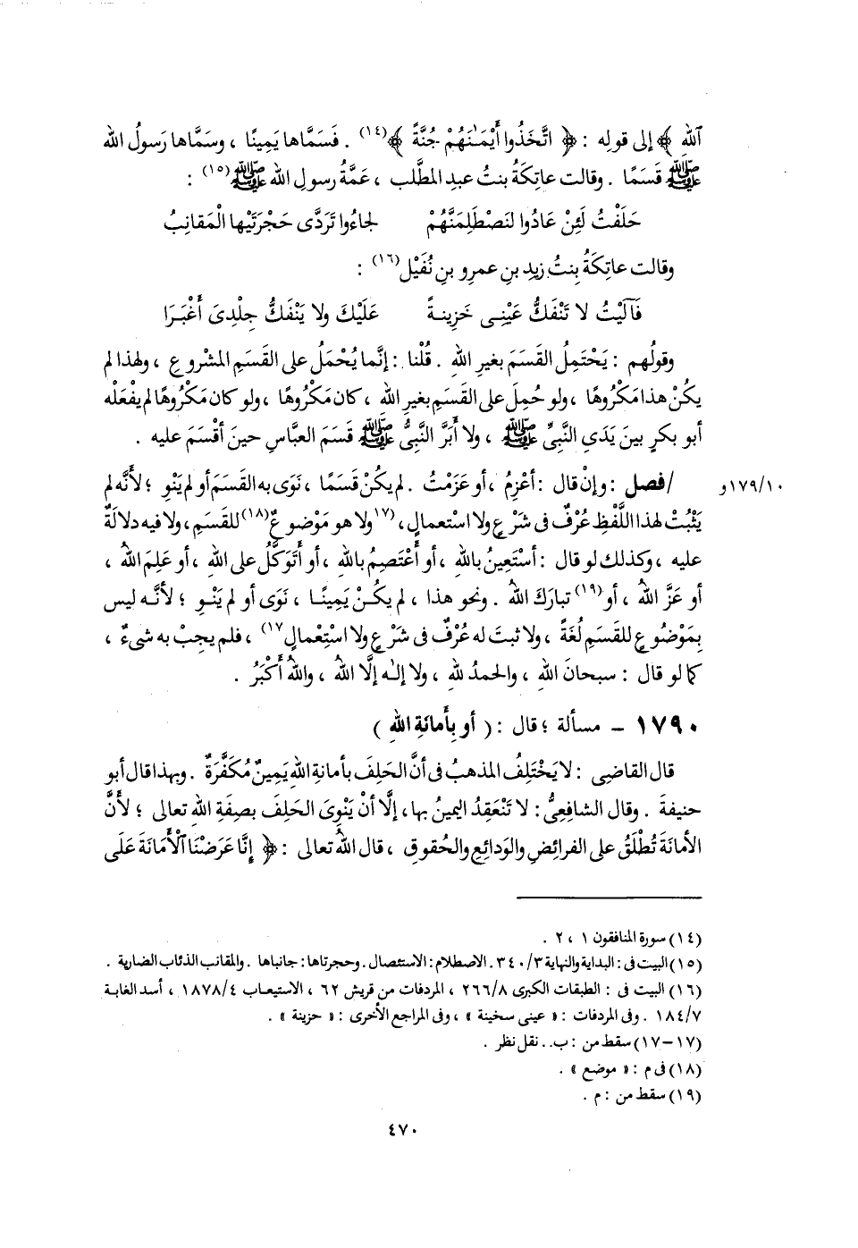 اللَّهِ} إلى قولِه: {اتَّخَذُوا أَيْمَانَهُمْ جُنَّةً} (١٤). فَسَمَّاها يَمِينًا، وسَمَّاها رَسولُ اللَّه -صلى اللَّه عليه وسلم- قَسَمًا وقالت عاتِكَةُ بنتُ عبدِ المطَّلب، عَمَّةُ رسولَ اللَّه -صلى اللَّه عليه وسلم- (١٥):