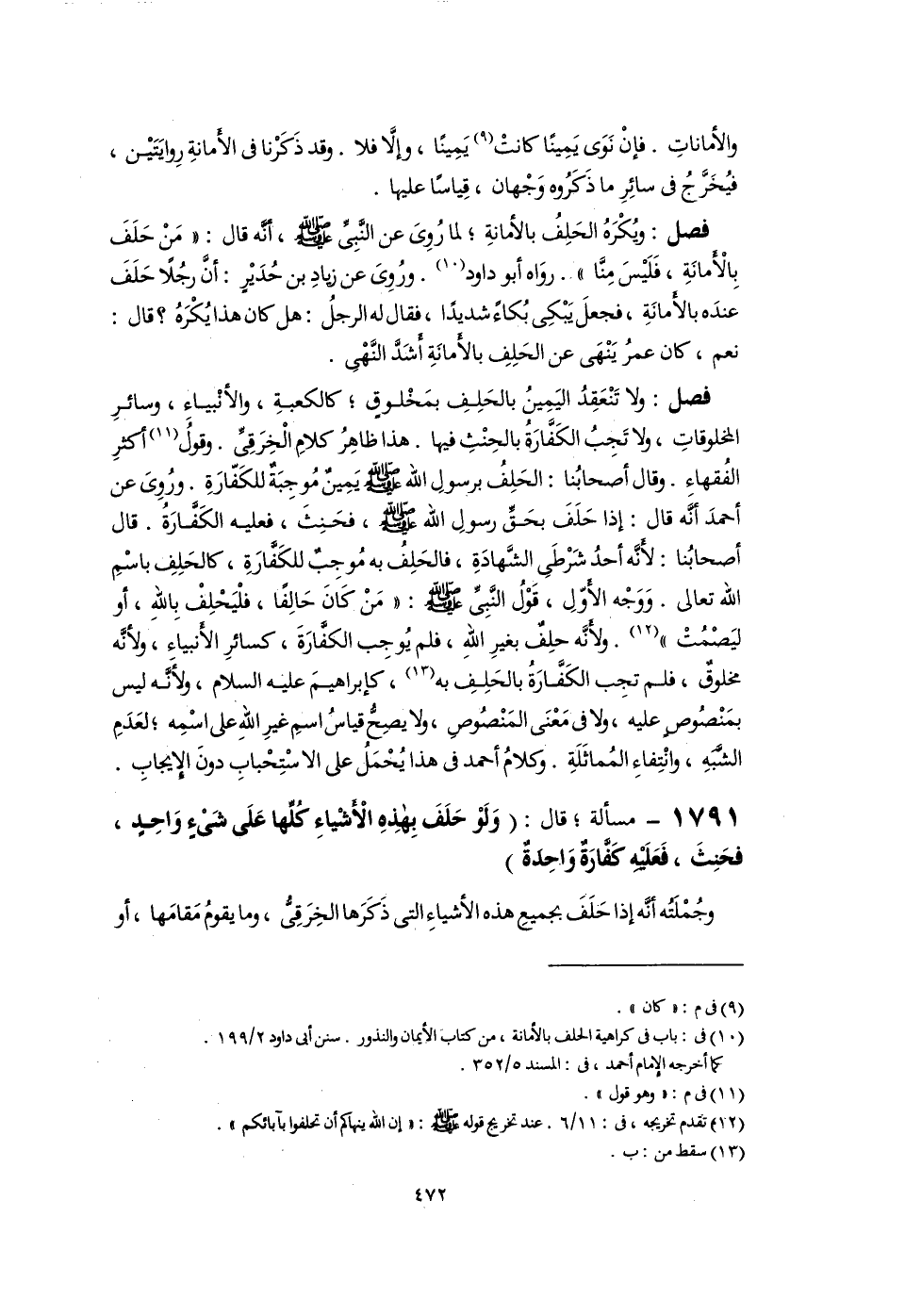 فصل: ويُكْرَهُ الحَلِفُ بالأمانةِ؛ لما رُوِىَ عن النَّبِىِّ -صلى اللَّه عليه وسلم-، أَنَّه قال: "مَن حَلَفَ بِالأَمانَةِ، فَلَيْسَ مِنَّا". روَاه أبو داود (١٠). ورُوِىَ عن زيادِ بن حُدَيْرٍ: أَنَّ رجُلًا حَلَفَ عندَه بالأَمانَةِ، فجعلَ يَبْكِى بُكاءً شديدًا، فقال له الرجلُ: هل كان هذا يُكْرَهُ؟ قال: نعم، كان عمرُ يَنْهَى عن الحَلِفِ بالأَمانَةِ أَشَدَّ النَّهْى.