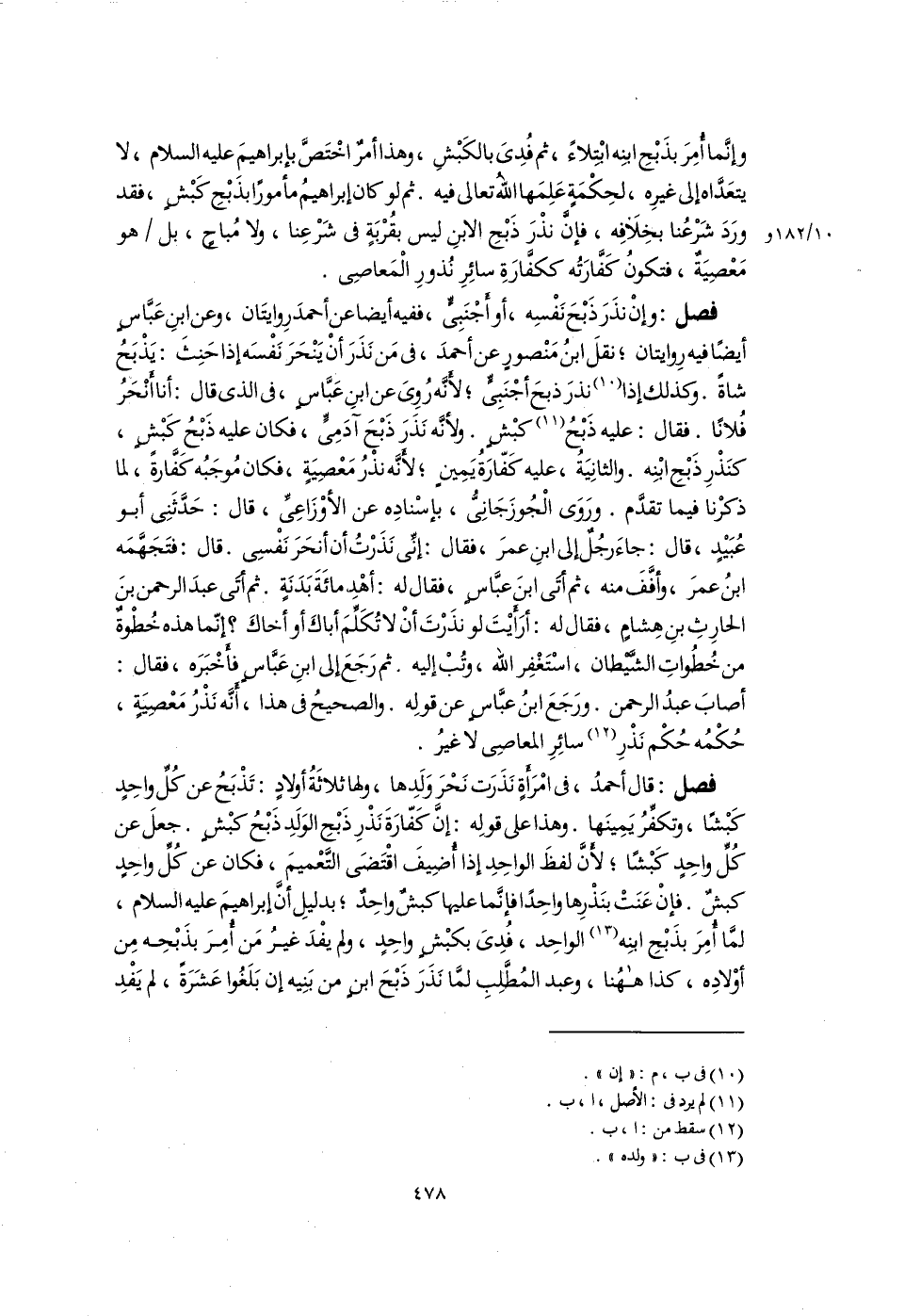 وإنَّما أُمِرَ بذَبْحِ ابنِه ابْتِلاءً، ثم فُدِىَ بالكَبْشِ، وهذا أمرٌ اخْتَصَّ بإبراهيمَ عليه السلام، لا يتعَدَّاه إلى غيرِه، لحِكْمَةٍ عَلِمَها اللَّه تعالى فيه. ثم لو كان إبراهيمُ مأمورًا بذَبْحِ كَبْشٍ، فقد ورَدَ شَرعُنا بخِلَافِه، فإنَّ نذْرَ ذَبْحِ الابنِ ليس بقرْبَةٍ فى شَرْعِنا، ولا مُباحٍ، بل هو مَعْصِيَةٌ، فتكونُ كَفَّارَتُه ككفَّارَةِ سائِرِ نُذورِ الْمَعاصِى.