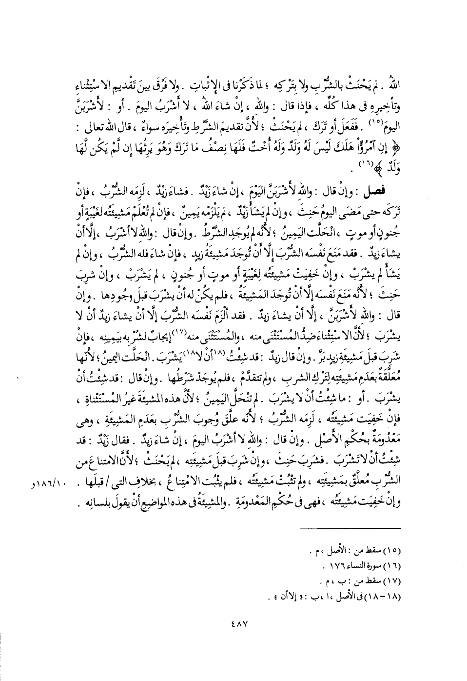 اللَّهُ. لم يَحْنَثْ بالشُّرْبِ ولا بِتَرْكِه؛ لما ذَكَرْنا فى الإِثْباتِ. ولا فَرْقَ بينَ تَقْديمِ الاسْتِثْناءِ وتأخِيرِهِ فى هذا كُلِّه، فإذا قال: واللَّهِ، إنْ شاءَ اللَّه، لا أَشْرَبُ اليومَ. أو: لأَشْرَبَنَّ اليومَ (١٥). فَفَعَلَ أو تَرَكَ، لم يَحْنَثْ؛ لأنَّ تقديمَ الشَّرْطِ وتَأْخِيرَه سواءٌ، قال اللَّه تعالى: {إِنِ امْرُؤٌ هَلَكَ لَيْسَ لَهُ وَلَدٌ وَلَهُ أُخْتٌ فَلَهَا نِصْفُ مَا تَرَكَ وَهُوَ يَرِثُهَا إِنْ لَمْ يَكُنْ لَهَا وَلَدٌ} (١٦).