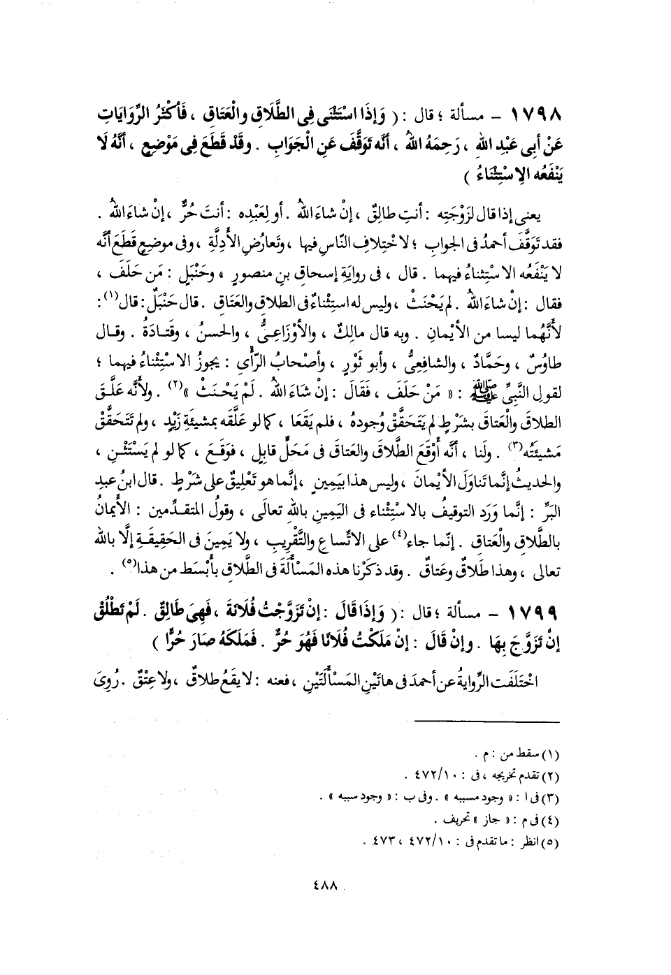 ١٧٩٨ - مسألة؛ قال: (وَإِذَا اسْتَثْنَى فِى الطَّلَاقِ والْعَتَاقِ، فَأَكْثَرُ الرِّوَايَاتِ عَنْ أبِى عَبْدِ اللَّهِ، رَحِمَهُ اللَّهُ، أنَّه تَوَقَّفَ عَنِ الْجَوَابِ. وقَدْ قَطَعَ فِى مَوْضِعٍ، أَنَّهُ لَا يَنْفَعُه الِاسْتِثْنَاءُ)