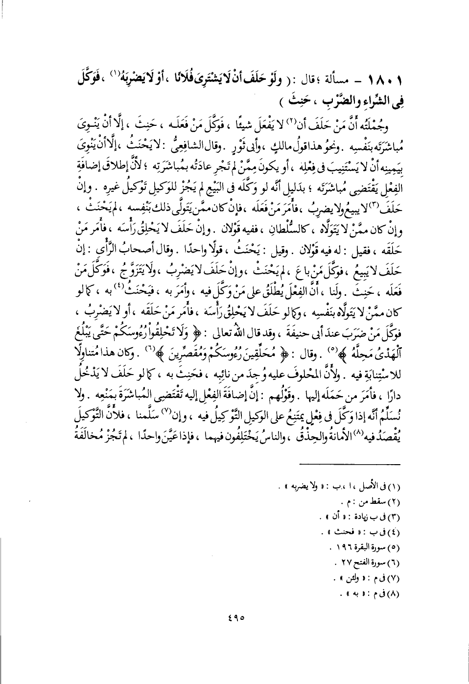 وجُمْلَتُه أَنَّ مَنْ حَلَفَ أن (٢) لا يفْعَلَ شيئًا، فَوكَّلَ مَنْ فَعَلَه، حَنِثَ، إِلَّا أَنْ يَنْوِىَ مُباشَرَتَه بنَفْسِه. ونحوُ هذا قولُ مالكٍ، وأبى ثَوْرٍ. وقال الشافِعِىُّ: لا يَحْنَثُ، إِلَّا أَنْ يَنْوِىَ بِيَمِينِه أَنْ لا يَسْتَنِيبَ فى فِعْلِه، أو يكونَ مِمَّنْ لم تَجْرِ عادَتُه بمُباشَرَتِه؛ لأنَّ إطلاقَ إضافَةِ الفِعْلِ يَقْتَضِى مُباشَرَتَه، بدَليلِ أنَّه لو وَكَّلَه فى البَيْعِ لم يَجُزْ للوَكيلِ تَوْكيلُ غيرِه. وإِنْ حَلَفَ (٣) لا يبيعُ ولا يضرِبُ، فأَمَرَ مَنْ فَعَلَه، فإنْ كان ممَّن يَتَولَّى ذلك بَنْفِسه، لم يَحْنَث، وإِنْ كان ممَّنْ لا يَتَوَلَّاه، كالسُّلْطانِ، ففيه قَوْلان. وإِنْ حَلَفَ لا يَحْلِقُ رَأْسَه، فأَمَر مَنْ حَلَقَه، فقيل: له فيه قَوْلان. وقيل: يَحْنَثُ، قولًا واحدًا. وقال أصحابُ الرَّأْىِ: إِنْ حَلَفَ لا يَبِيعُ، فوكَّلَ مَنْ باعَ، لم يَحْنَثْ، وإِنْ حَلَفَ لا يَضْرِبُ، ولَا يَتَزَوَّجُ، فَوَكَّلَ مَنْ فَعَلَه، حَنِث. ولَنا، أَنَّ الفِعْلَ يُطْلَقُ على مَنْ وَكَّلَ فيه، وأَمَرَ به، فيَحْنَثُ (٤) به، كما لو كان ممَّنْ لا يَتَوَّلاه بنَفْسِه، وكما لو حَلَفَ لا يَحْلِقُ رَأْسَه، فأَمَر مَنْ حَلَقَه، أو لا يَضْرِبُ، فوكَّلَ مَنْ ضَرَبَ عندَ أبى حنيفَةَ، وقد قال اللَّه تعالى: {وَلَا تَحْلِقُوا رُءُوسَكُمْ حَتَّى يَبْلُغَ الْهَدْيُ مَحِلَّهُ} (٥). وقال: {مُحَلِّقِينَ رُءُوسَكُمْ وَمُقَصِّرِينَ} (٦). وكان هذا مُتناوِلًا للاسْتِنابَةِ فيه. ولأنَّ المحْلوفَ عليه وُجِدَ من نائِبِه، فحَنِثَ به، كما لو حَلَفَ لا يَدْخُلُ دارًا، فأمَرَ من حَمَلَه إليها. وقَوْلُهم: إِنَّ إضافَةَ الفِعْلِ إليه تَقْتَضِى المُباشَرَةَ بمَنْعِه. ولا نُسَلِّمُ أنَّه إذا وَكَّلَ فى فِعْل يمتَنِعُ على الوكيلِ التَّوْكِيلُ فيه، وإن (٧) سَلَّمنا، فلأَنَّ التَّوْكيلَ يُقْصَدُ فيه (٨) الأمانةُ والحِذْقُ، والناسُ يَخْتَلِفُون فيهما، فإذا عَيَّنَ واحدًا، لم تَجُزْ مُخالَفَةُ